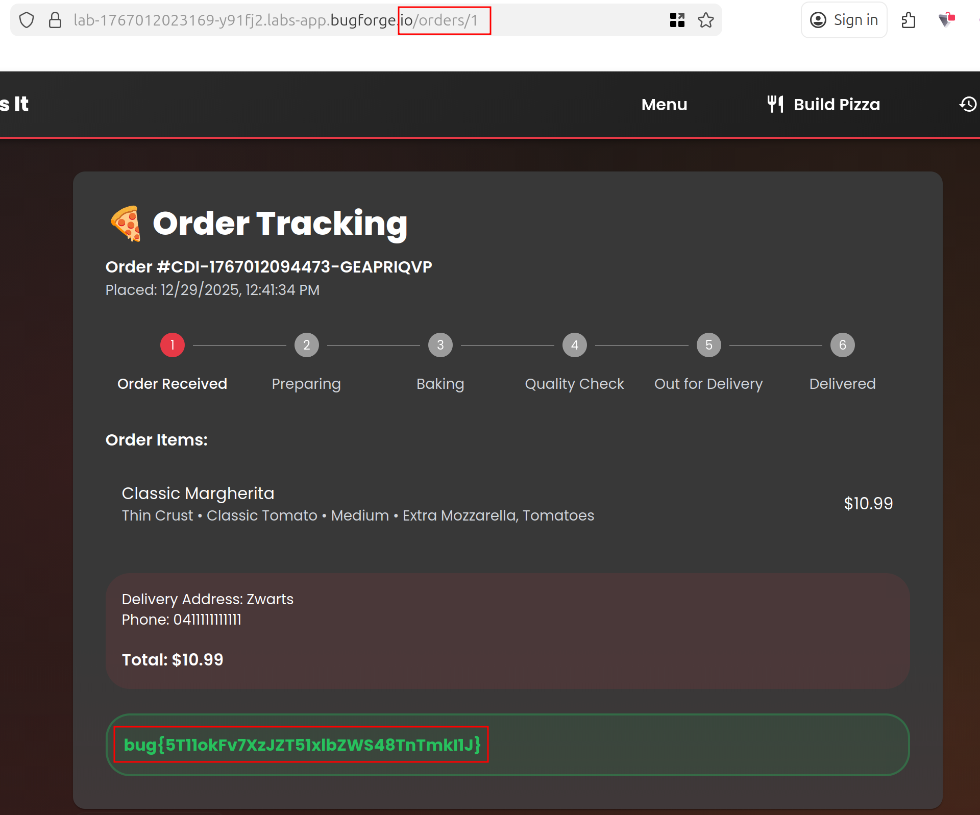 This confirmed that the backend exposes order data directly based on the supplied identifier.