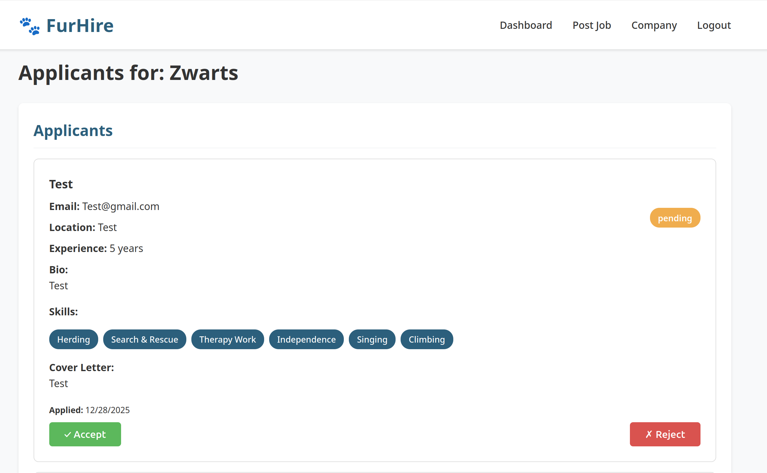 Switch back to the Recruiter account. Review incoming applications and accept the JobSeeker’s application.