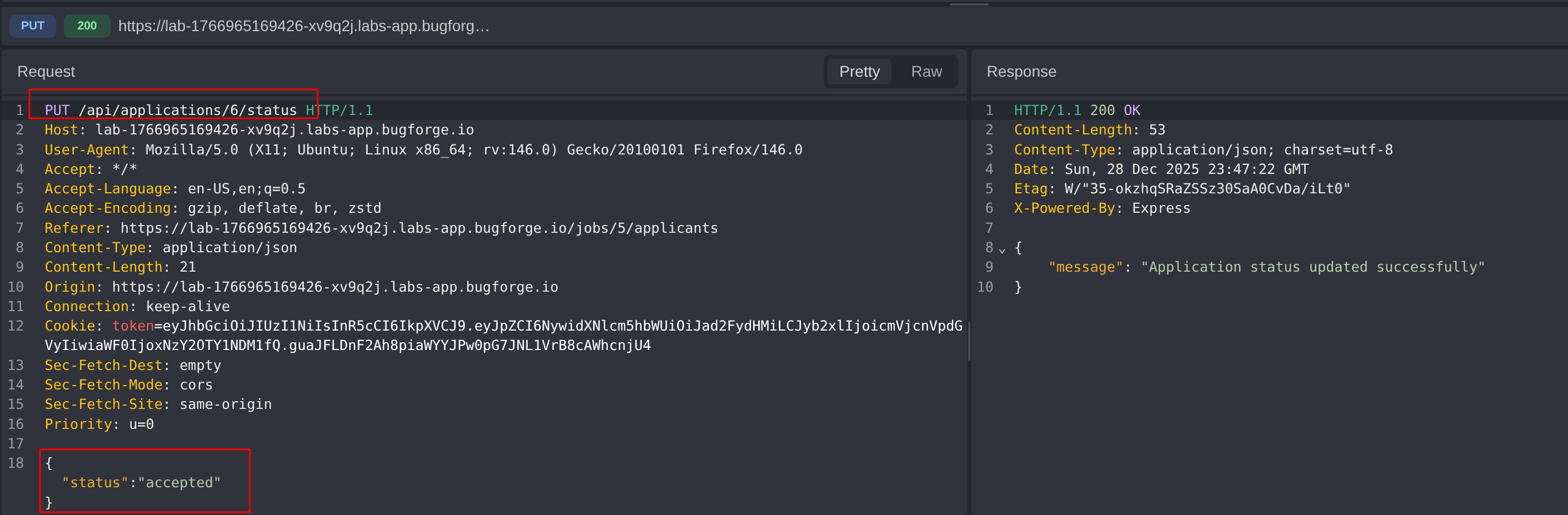 Inspect the network traffic related to the application status update. Identify and analyze the request payload responsible for updating the application state.