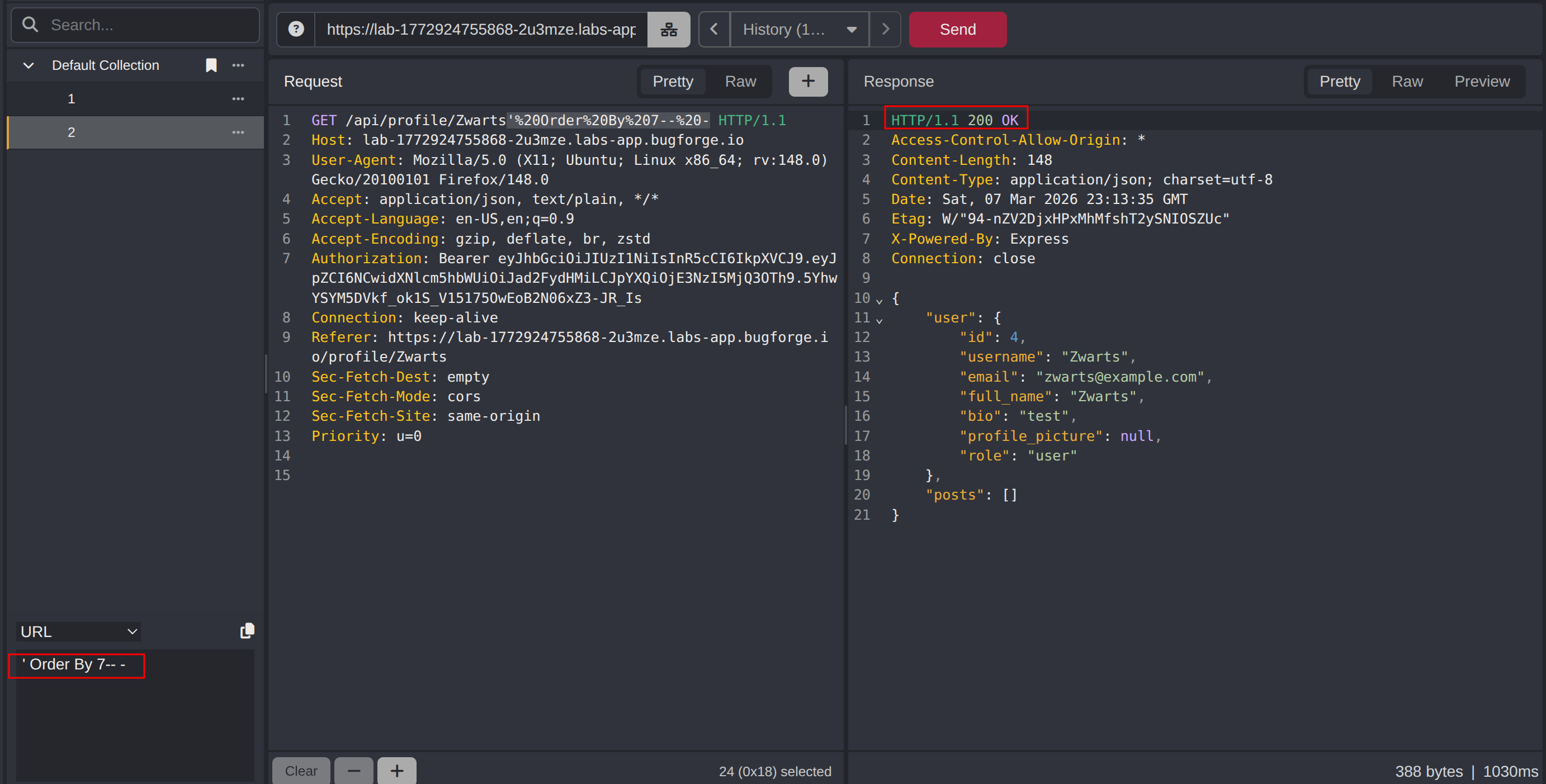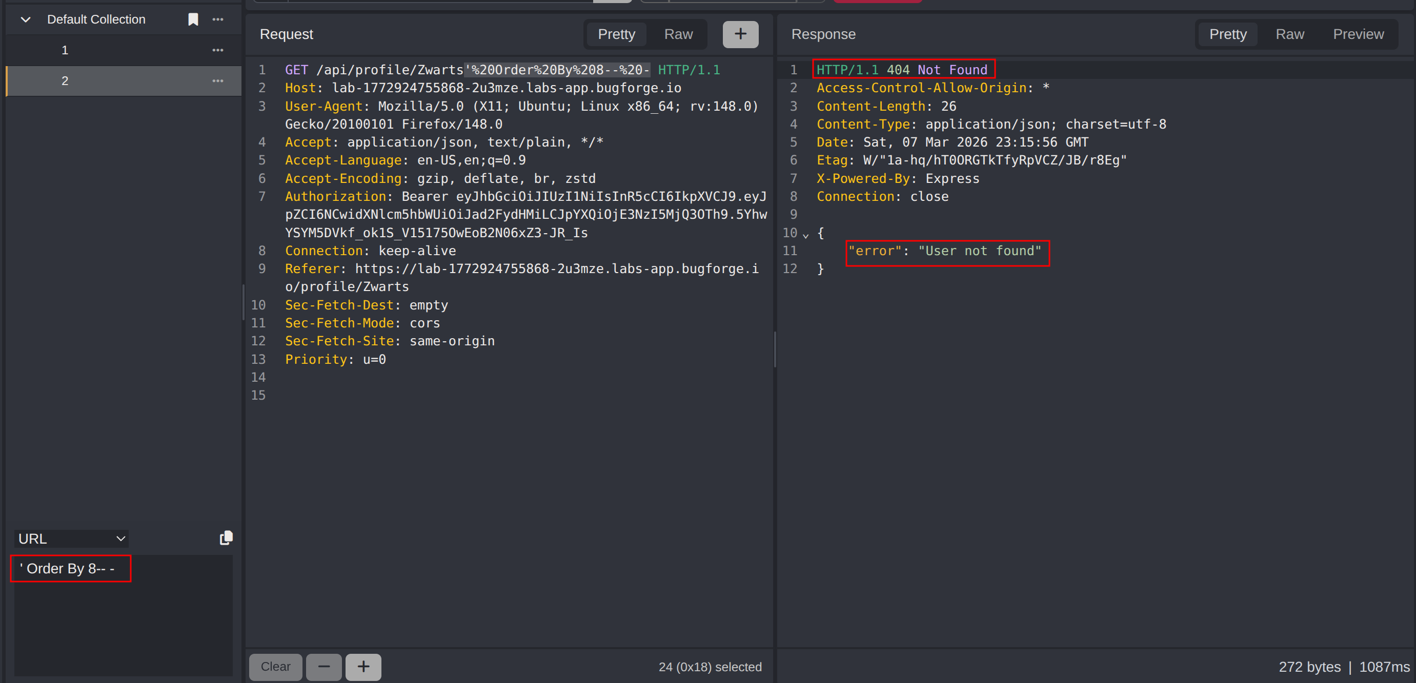 Test the profile endpoint for SQL injection by appending a single quote (') to the input parameter. Observe the application’s response for database errors or abnormal behavior that indicates the input is being interpreted as part of a SQL query.