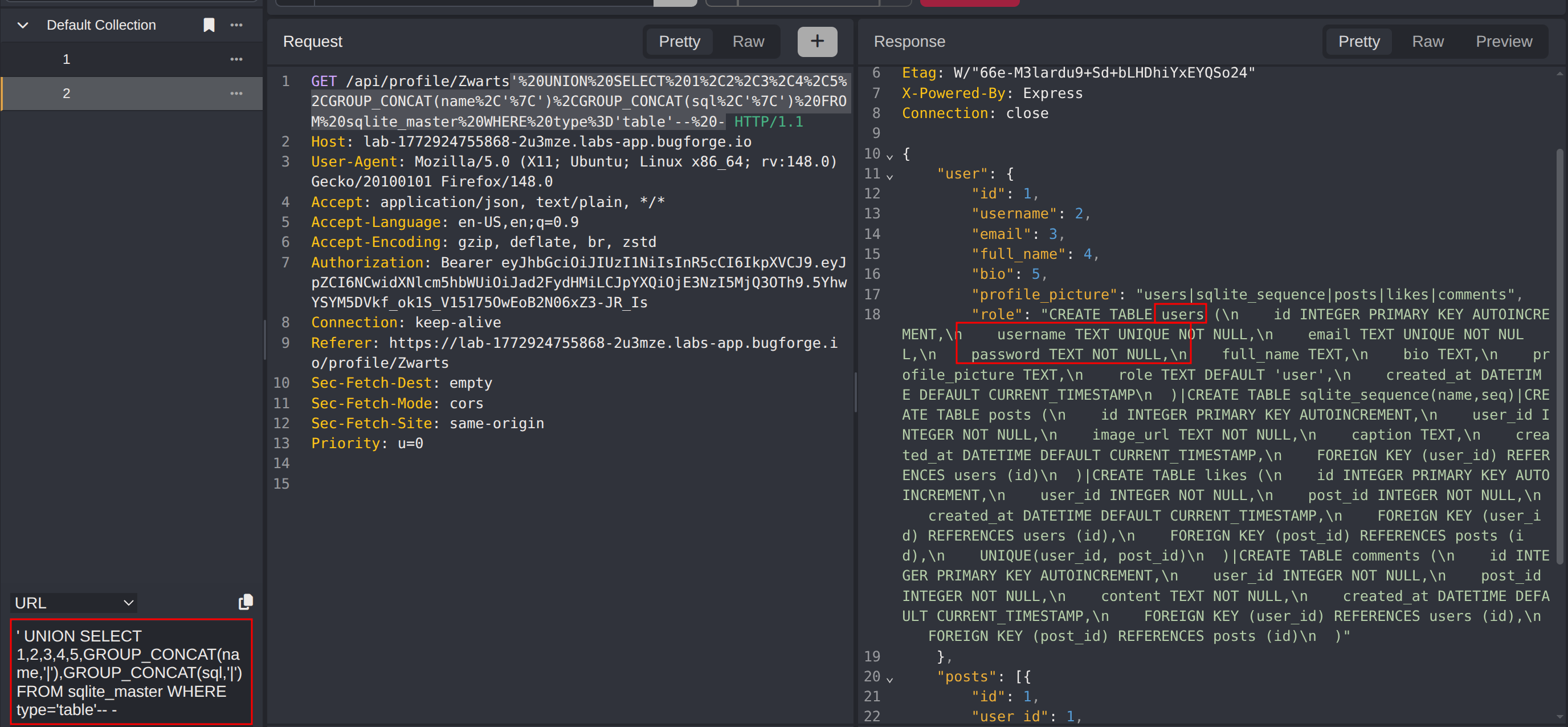 ASQL Injectionvulnerability was identified in theuser profileretrieval functionality where user-supplied input is concatenated directly into SQL queries without proper parameterization or input validation. By injecting a single quote into the profile endpoint, error-based confirmation of the vulnerability was achieved. Using the ORDER BY technique to enumerate the number of columns returned by the query, a UNION-based SQL injection attack was constructed to extract sensitive data from the underlying database. This allowed retrieval of the username and password fields from the users table, ultimately exposing the administrator credentials and the challenge flag.