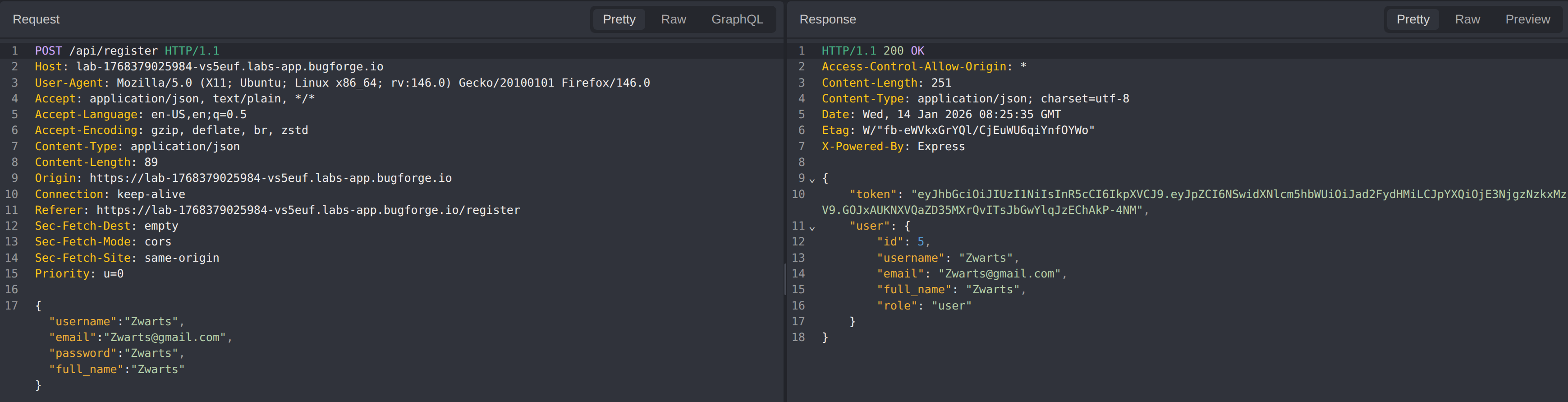 Analyse the registration request, to see if any roles are passed when creating a new user.