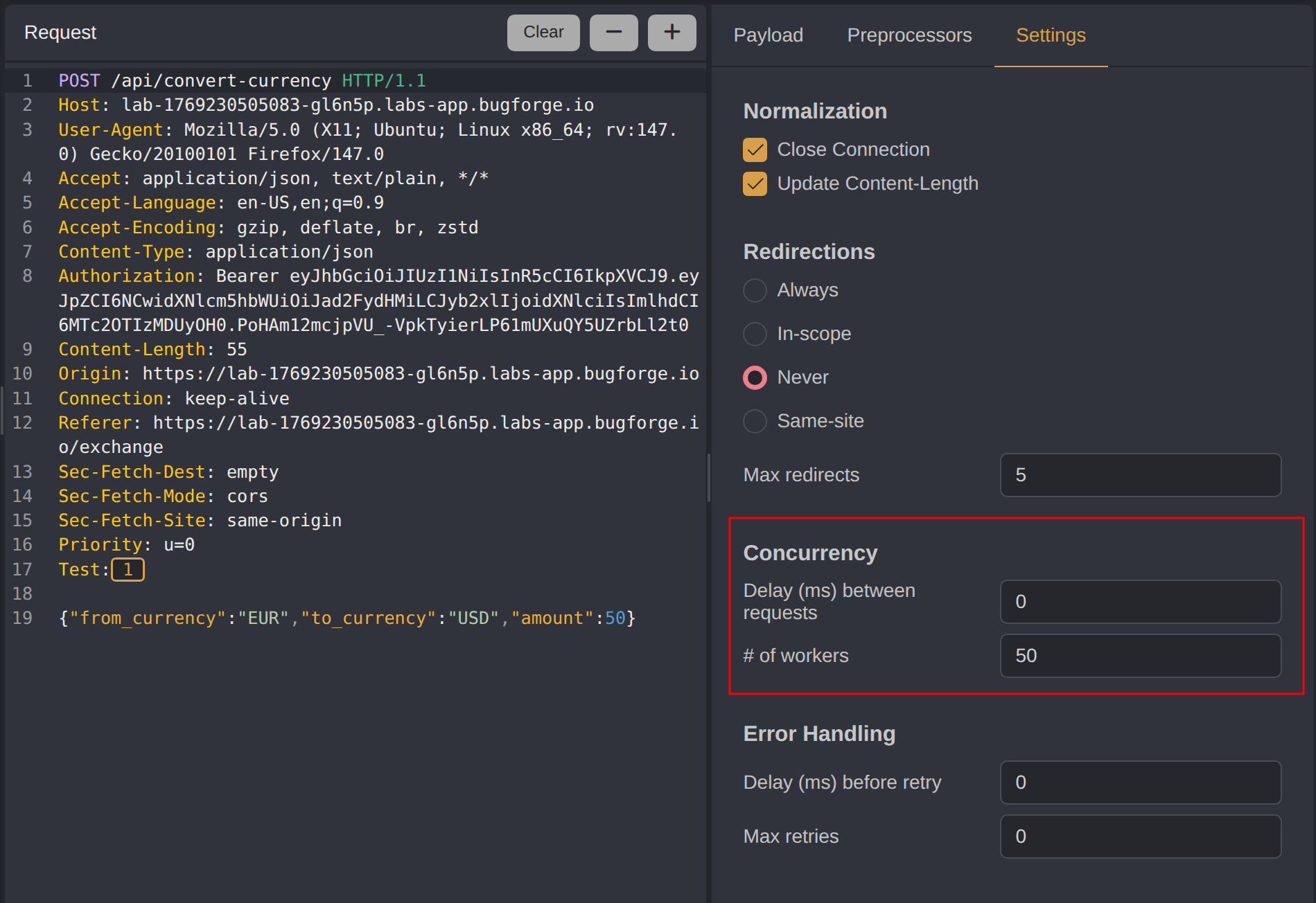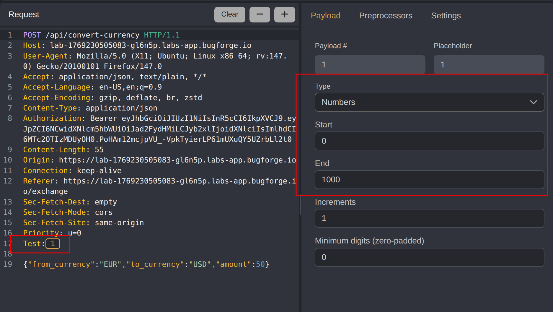 To test for this vulnerability, the /api/convert-currency POST request was sent to Caido’s Automate tool. A custom header Test:§1§ was added with a placeholder marker, and the payload was configured to use sequential numbers from 1 to 1000.
