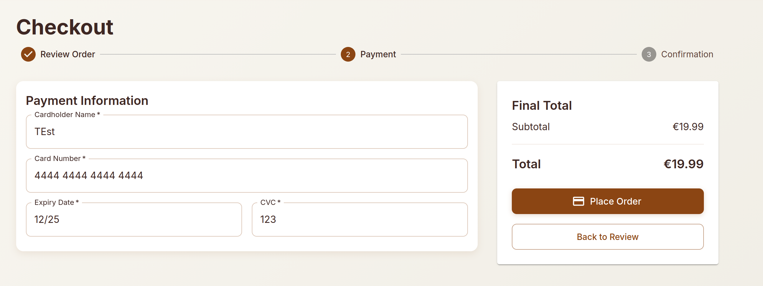 Initial testing focused on understanding the standard order flow by completing a legitimate purchase. The checkout process was analyzed by intercepting all requests to identify the sequence of API calls involved in order placement.