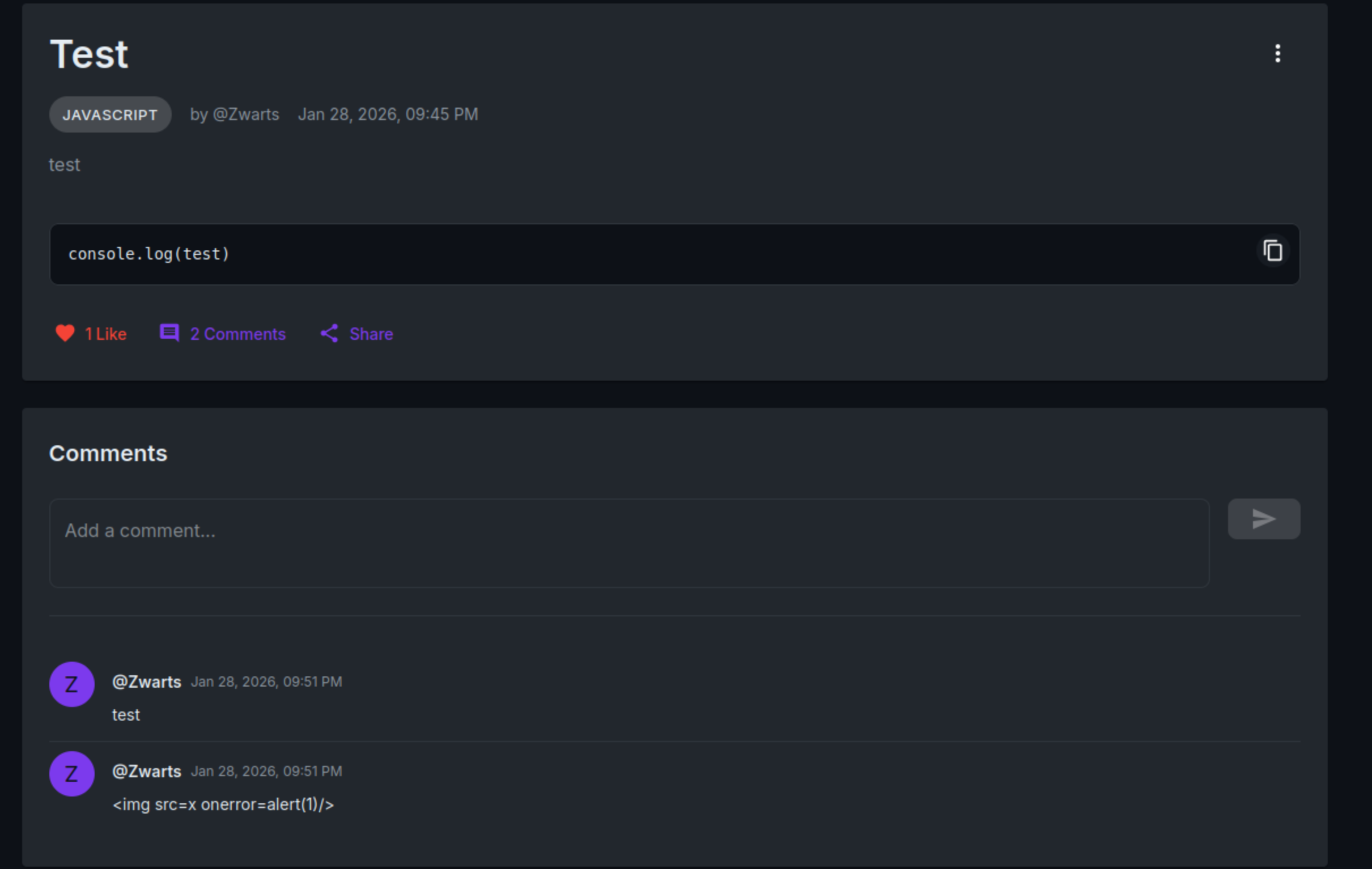 Creating the Snippet I’ve tested for XSS seeing that you can make the snippet public and other user’s can view the snippet. You might be able to trigger XSS and extract user sessions etc.