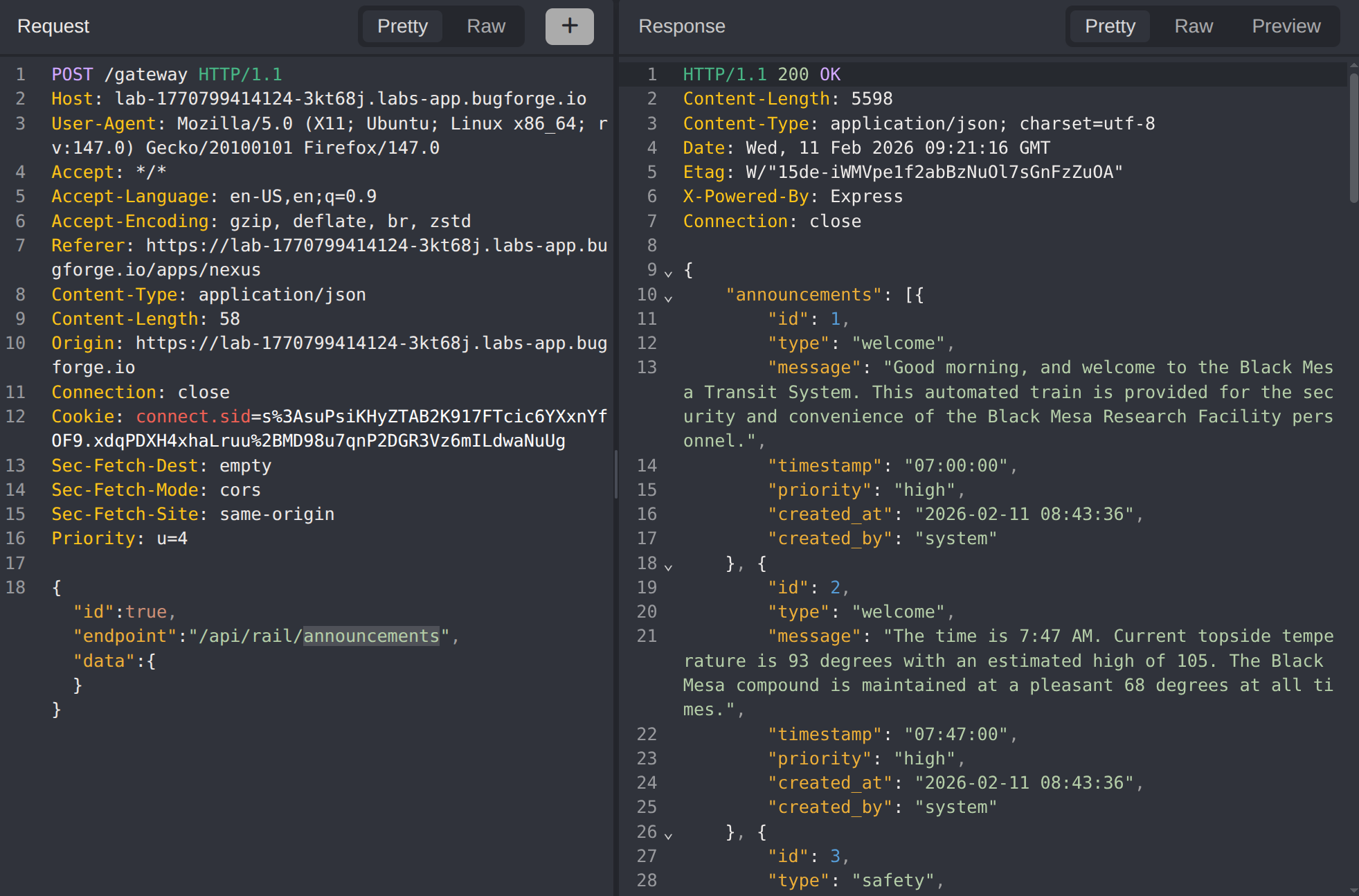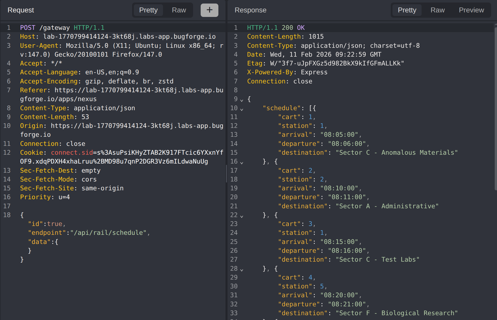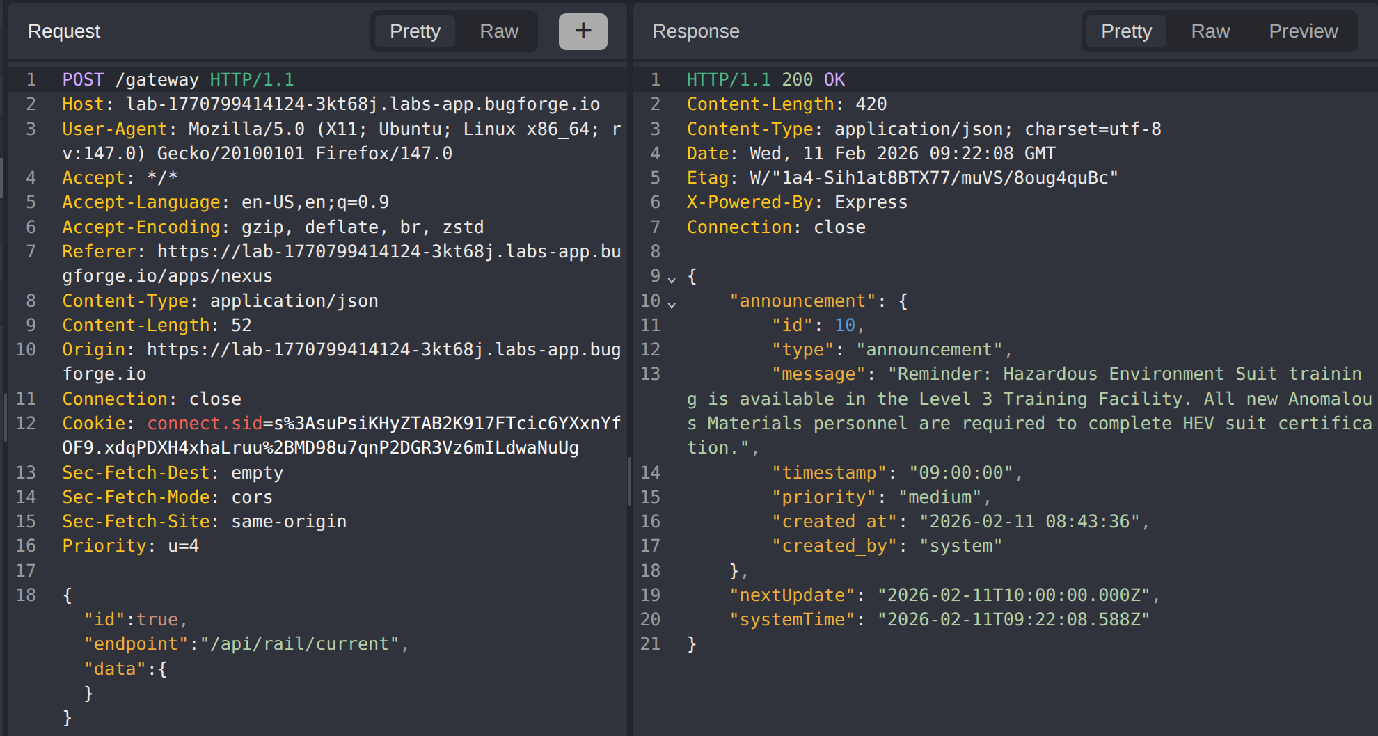 Access the Nexus notice board and analyse the source code for apps/nexus. A hardcoded APP_ID is present along with a POST request to a gateway endpoint. The request payload contains a JSON object with id, endpoint, and a data object.
