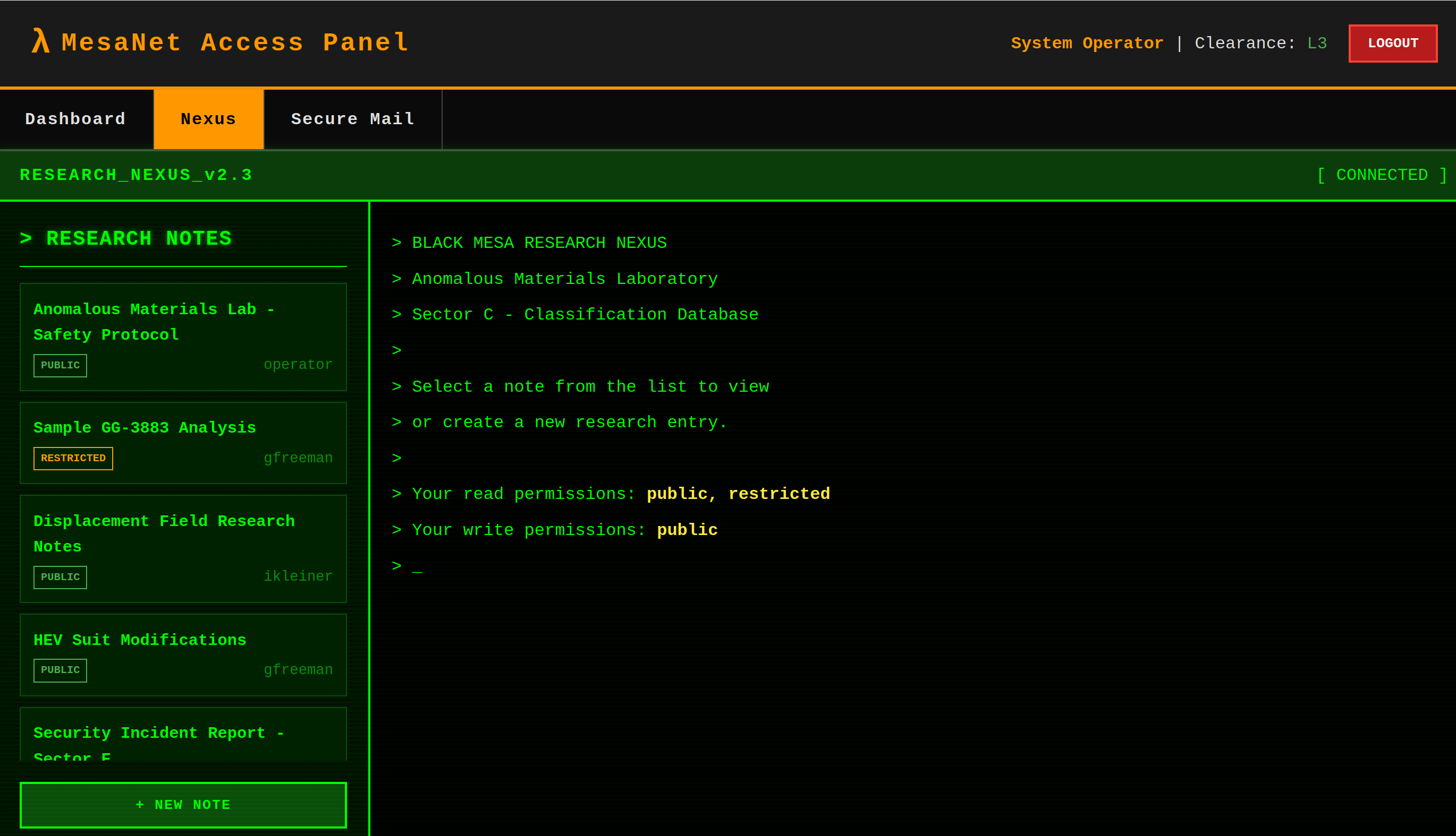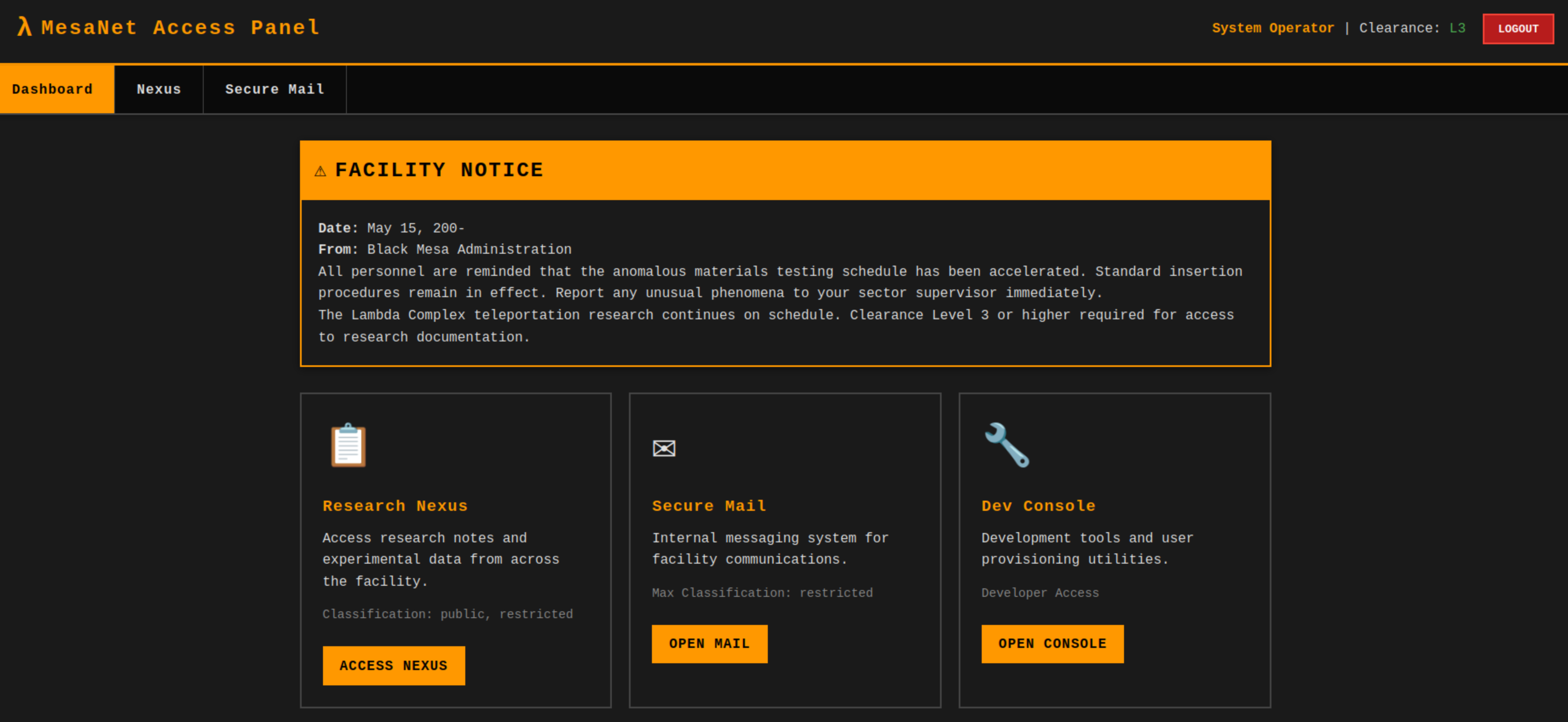 Log in with the provided credentials operator:operator. The application presents a dashboard with a notice board, secure email functionality, and the dev console discovered during enumeration.