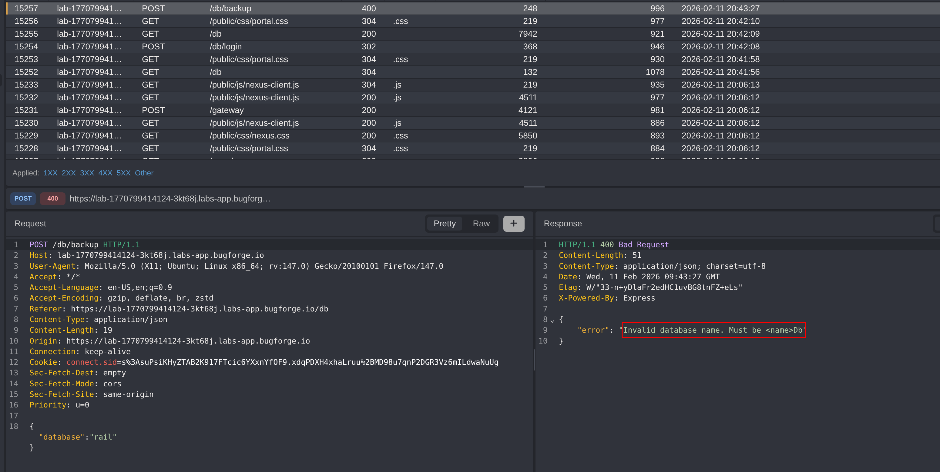 The portal allows downloading database backups when provided with a database name. Attempting a generic name reveals an error stating the database name must be suffixed with Db.