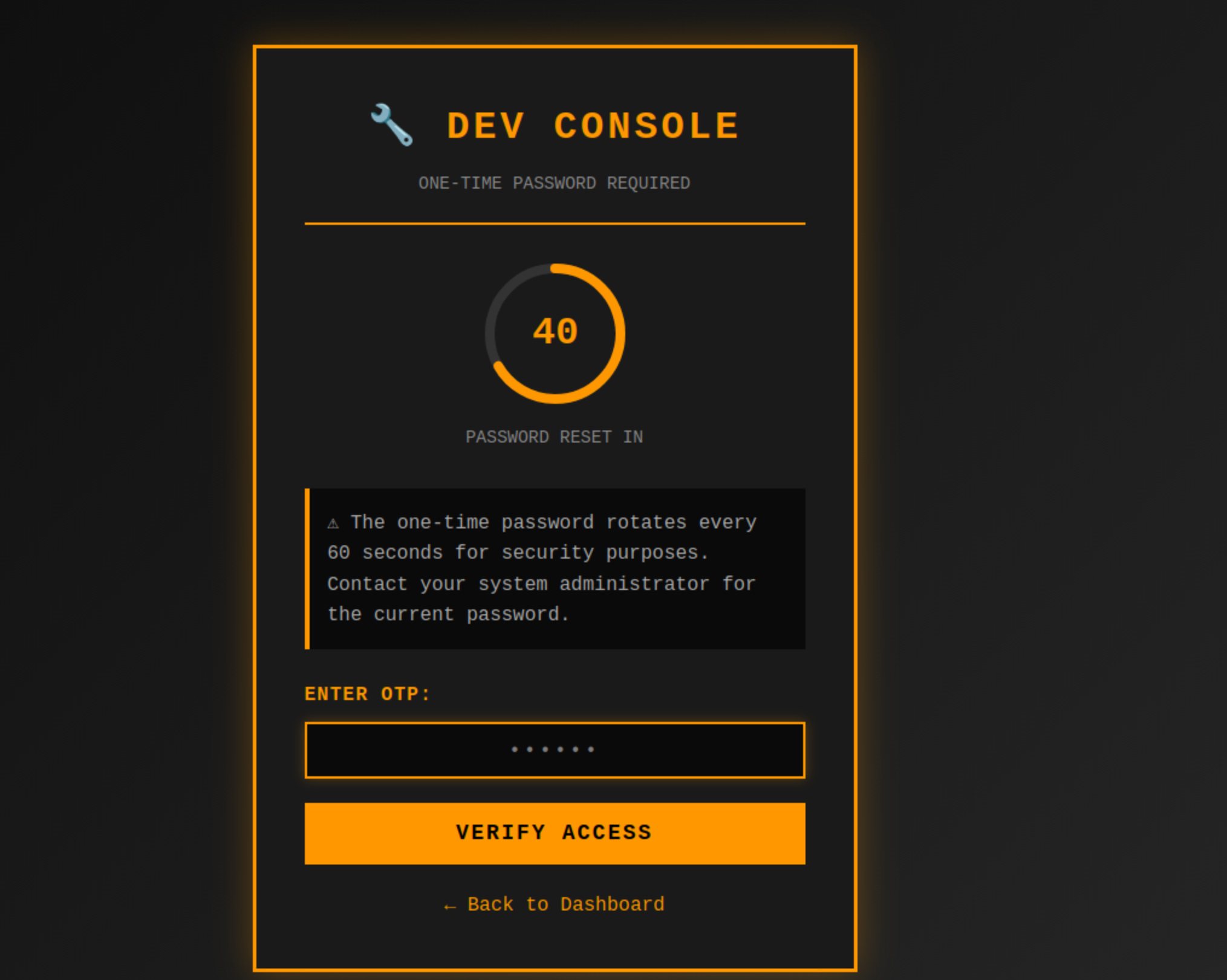 Enter the OTP in the dev console to gain access and retrieve the flag.