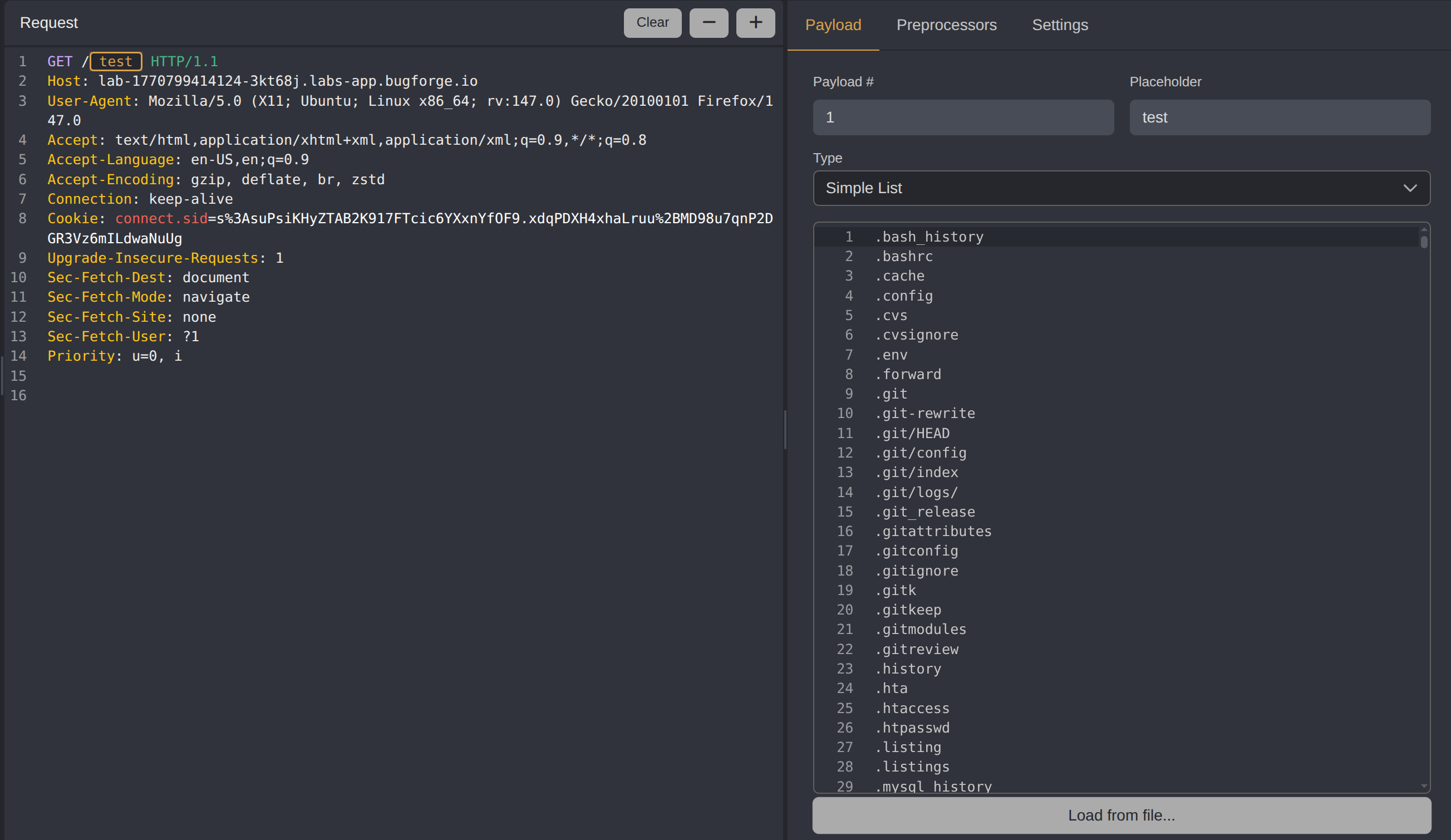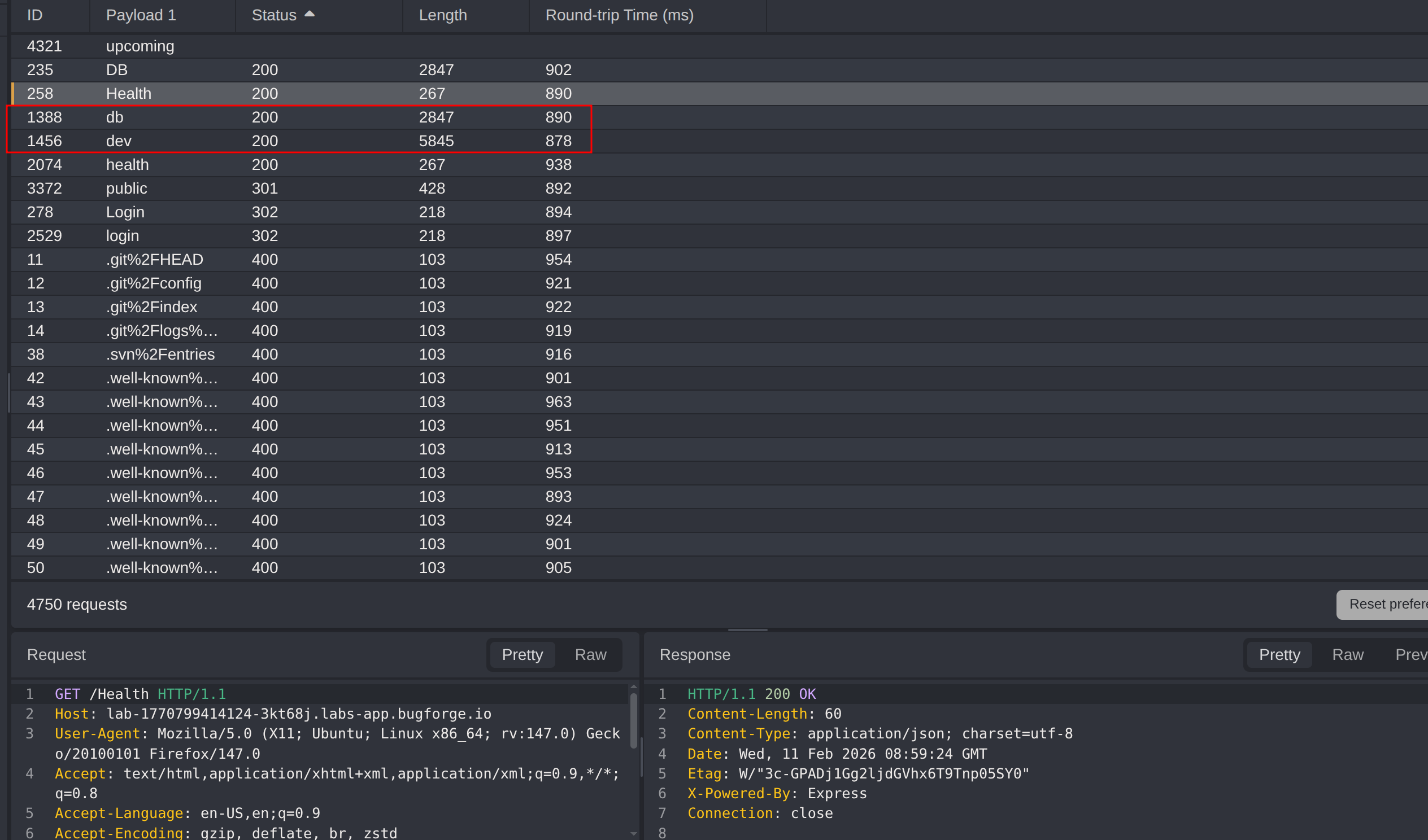Generate a custom wordlist themed around the challenge context (Half-Life / Black Mesa references with the Db suffix) and fuzz the database name parameter: