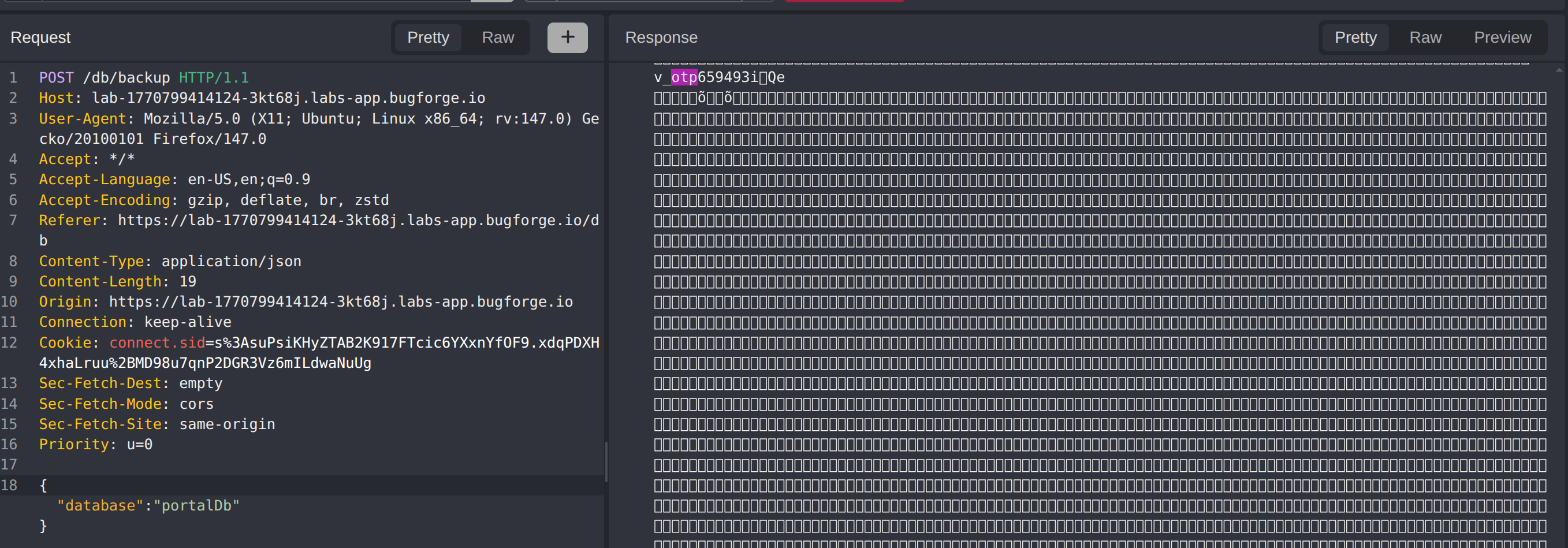 Navigate to the dev console and trigger the OTP generation. Return to the database admin portal, download the portalDb backup, and extract the OTP from the database contents.