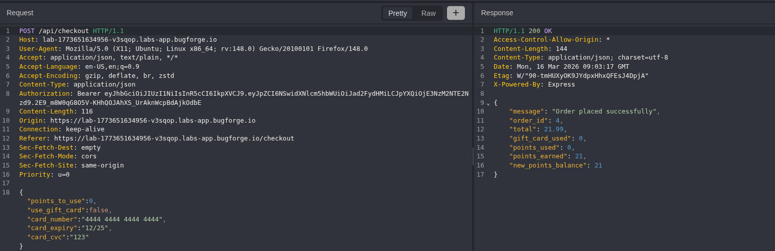 The Cafe Club application contains aBusiness Logic Flawin itsPUT /api/profileendpoint. The endpoint accepts a user-controlled JSON body and applies all supplied properties directly to the user record without validating which fields are permitted to be updated. By injecting apointsproperty into the profile update payload, an authenticated user can arbitrarily set their own loyalty point balance, bypassing the intended earn-per-purchase logic entirely.