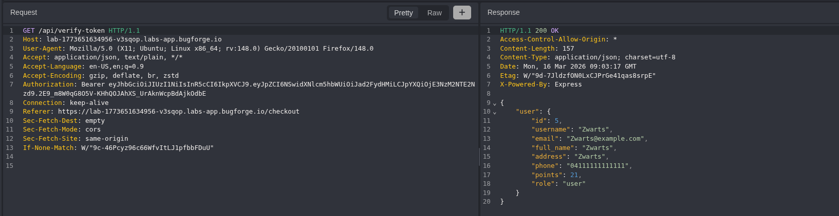 The role update was not successful, however notice that the verify-token response also returns our current points balance. This reveals that points are stored as a user attribute.